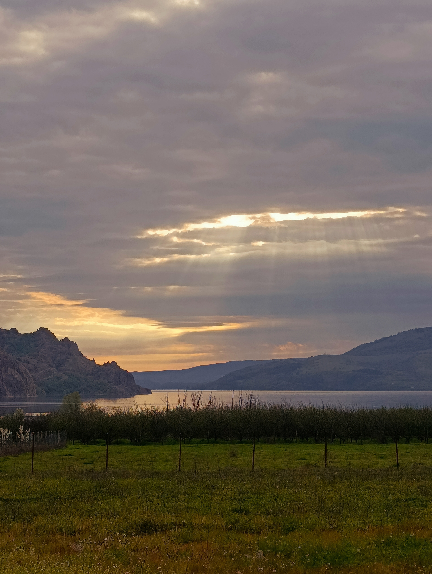 The image shows a landscape with a field in the foreground and a body of water in the middle ground, with mountains in the background. The sky is cloudy with rays of sunlight breaking through. A line…read more