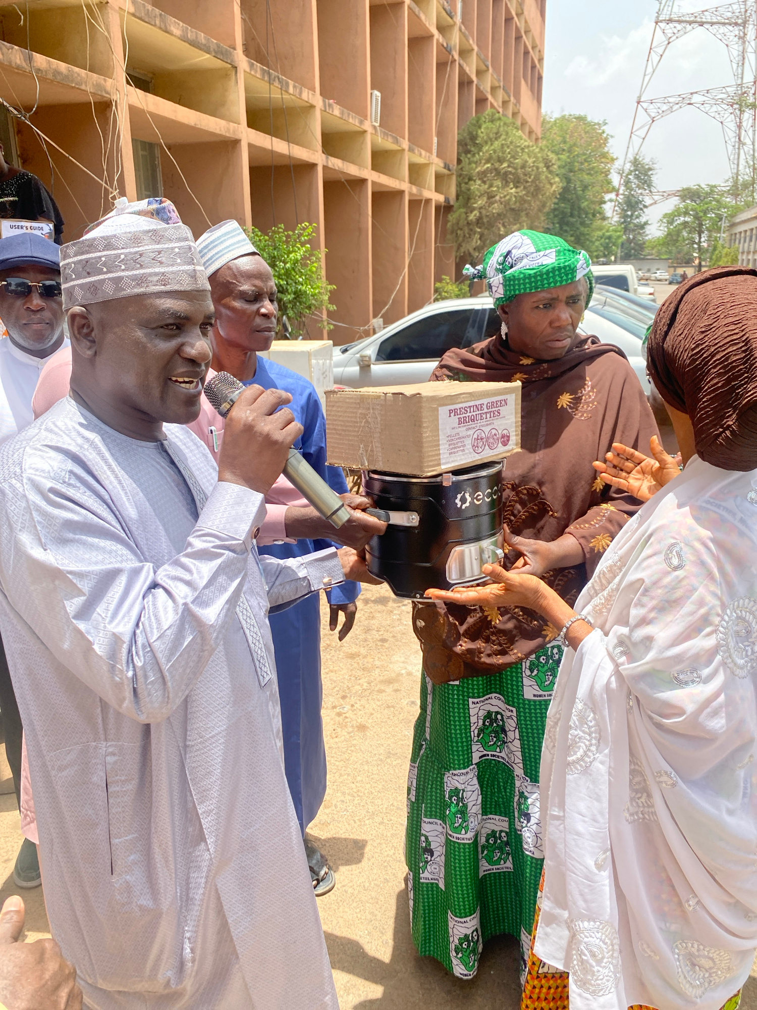 In Unguwar Rimi, Nigeria, a group of people are gathered outdoors near a light brown building. A man in a light purple traditional outfit holds a microphone and speaks. He is surrounded by other men wearing traditional Muslim caps, one of whom wears sunglasses and a blue cap. Two women stand to the side, one wearing a brown dress and a brown headscarf and the other wearing a white outfit with green and white patterned fabric. They appear to be examining a black device labeled "eco" with a box labeled "PRESTINE GREEN BRIQUETTES" attached. The fabric of the woman's dress includes text: "NATIONAL COUNCIL FOR WOMEN SOCIETIES, NIGERIA". A white vehicle is parked behind them. | Open Wire