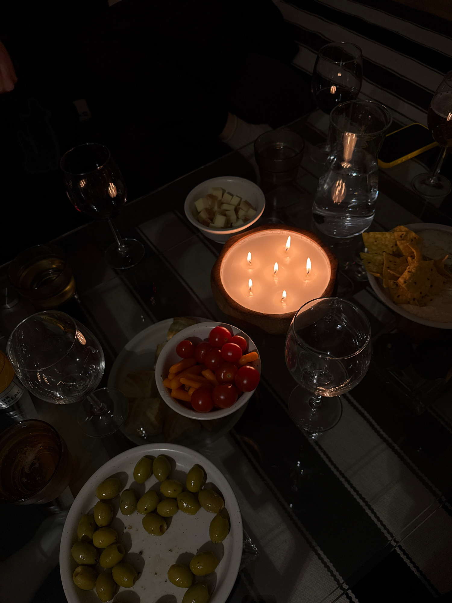 The image depicts a dimly lit table setting. A large, circular candle with multiple wicks is centrally positioned, casting light on nearby objects. Several wine glasses are scattered around the table, some appearing empty and others possibly containing wine. Various bowls and plates hold snacks such as olives, tomatoes with carrot sticks, cheese cubes, and tortilla chips with dip. A striped placemat or tablecloth is visible beneath the items. The scene suggests a casual gathering or dinner setting. No information about the specific location being in Montreal, Canada is present. | Open Wire