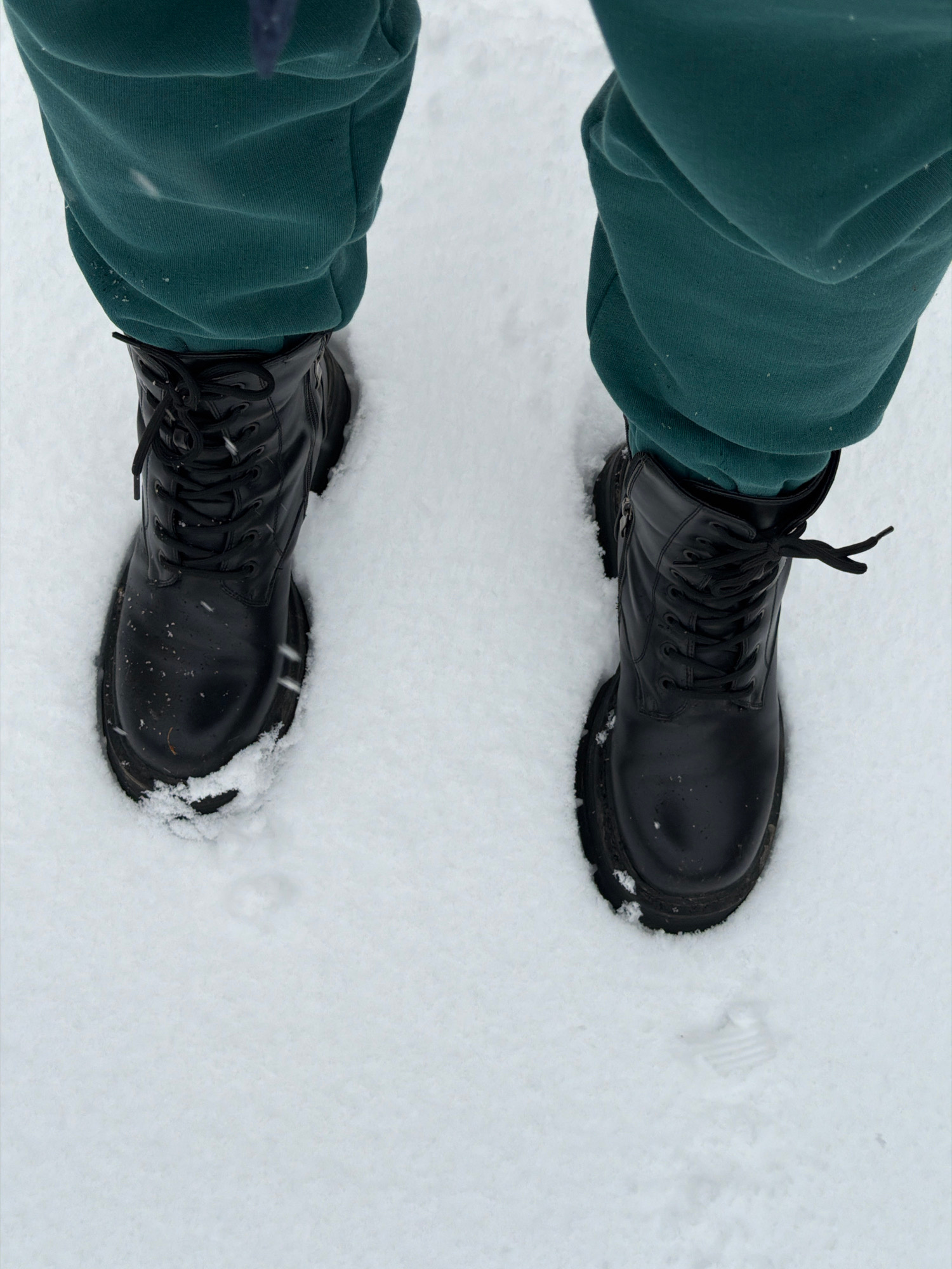 The image shows a view from above of two black leather boots standing in the snow. The boots are laced and have thick soles. The person wearing the boots is also wearing teal-colored sweatpants. The e…read more