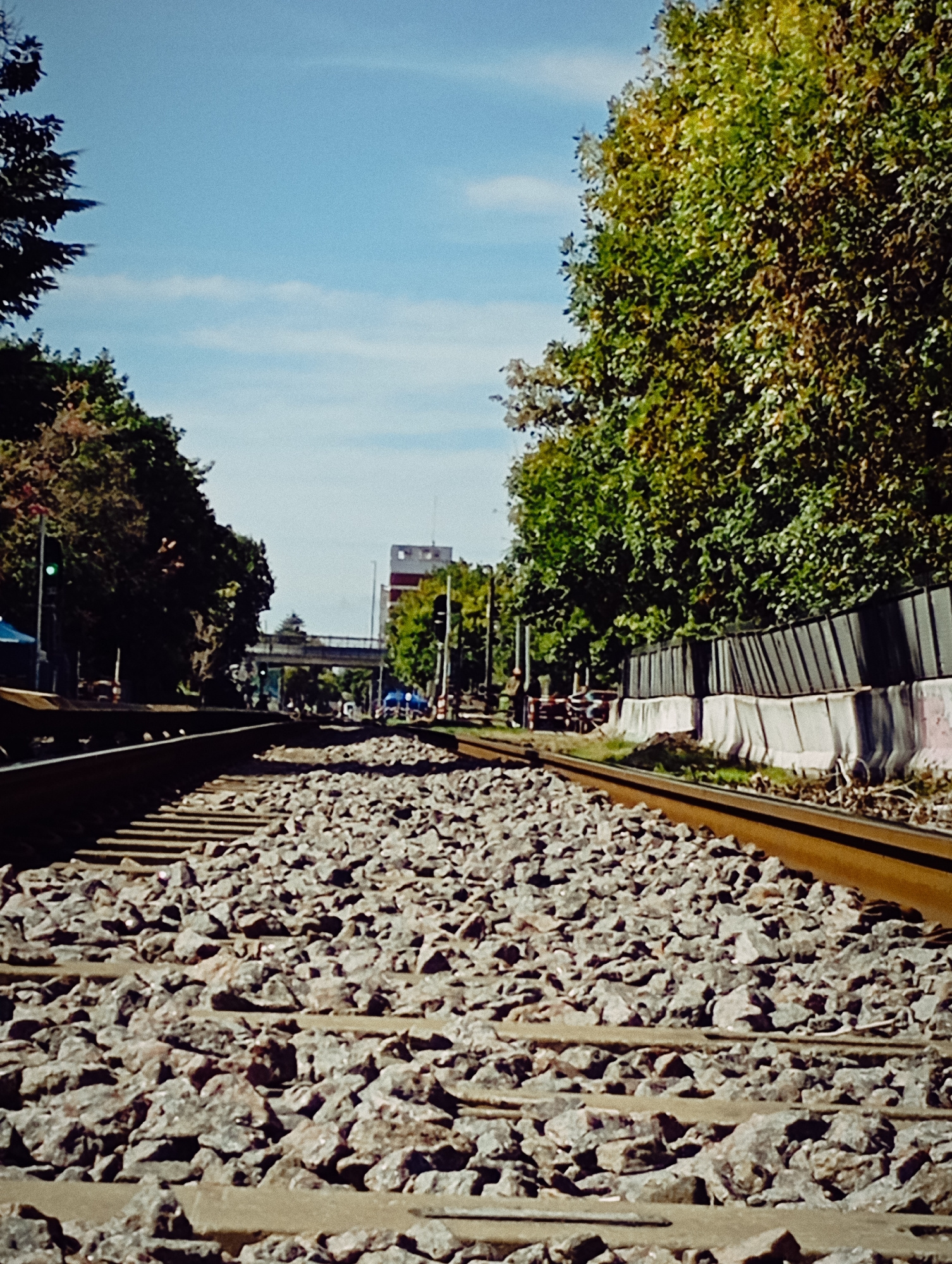 The image depicts a section of railway tracks in Buenos Aires, Argentina. The tracks are laid on a bed of gravel. Vegetation borders either side, with a fence on the right. In the background, a buildi…read more