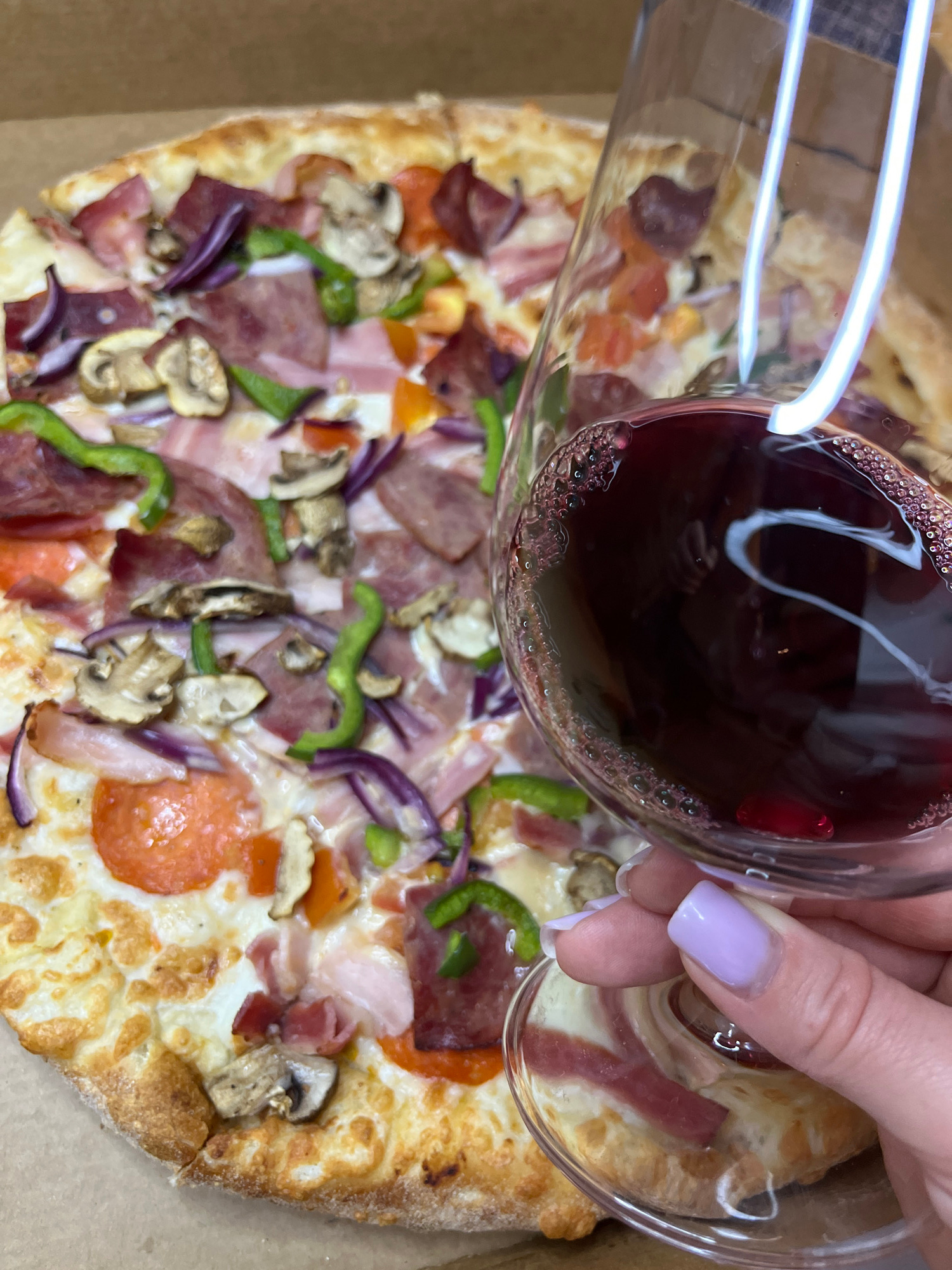 The image shows a partially consumed pizza in a cardboard box with a glass of red wine held above it by a person's hand with light purple nail polish. The pizza has various toppings including pepperon…read more