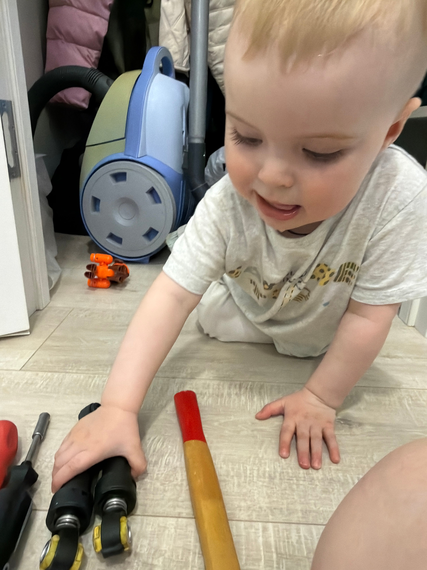 A toddler with blonde hair and a light gray t-shirt is lying on a light wood-patterned floor, interacting with objects. The toddler is holding black, tubular objects, possibly automotive parts. Next t…read more