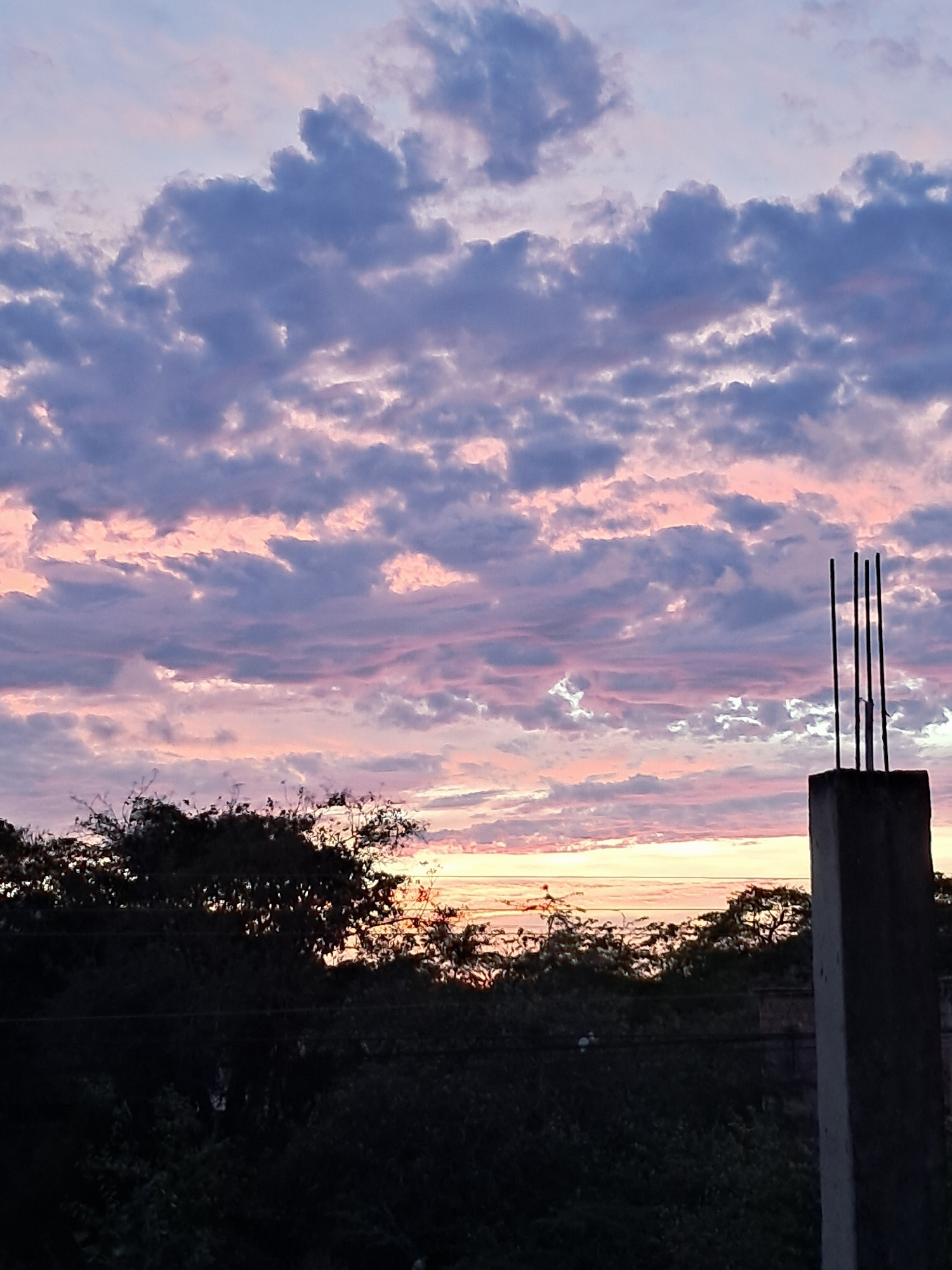 The image captures a dramatic sunset over what appears to be an urban or suburban environment. The sky is filled with clouds in shades of blue and pink, indicative of the setting sun. The light from t…read more