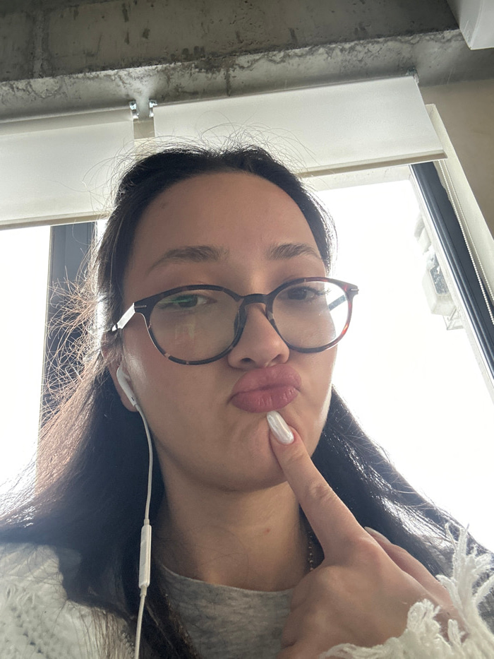 An indoor portrait displays a female individual, shown from the upper chest upward. She has dark hair, dark-framed eyeglasses with tortoiseshell patterns, and a white wired earphone inserted into her…read more