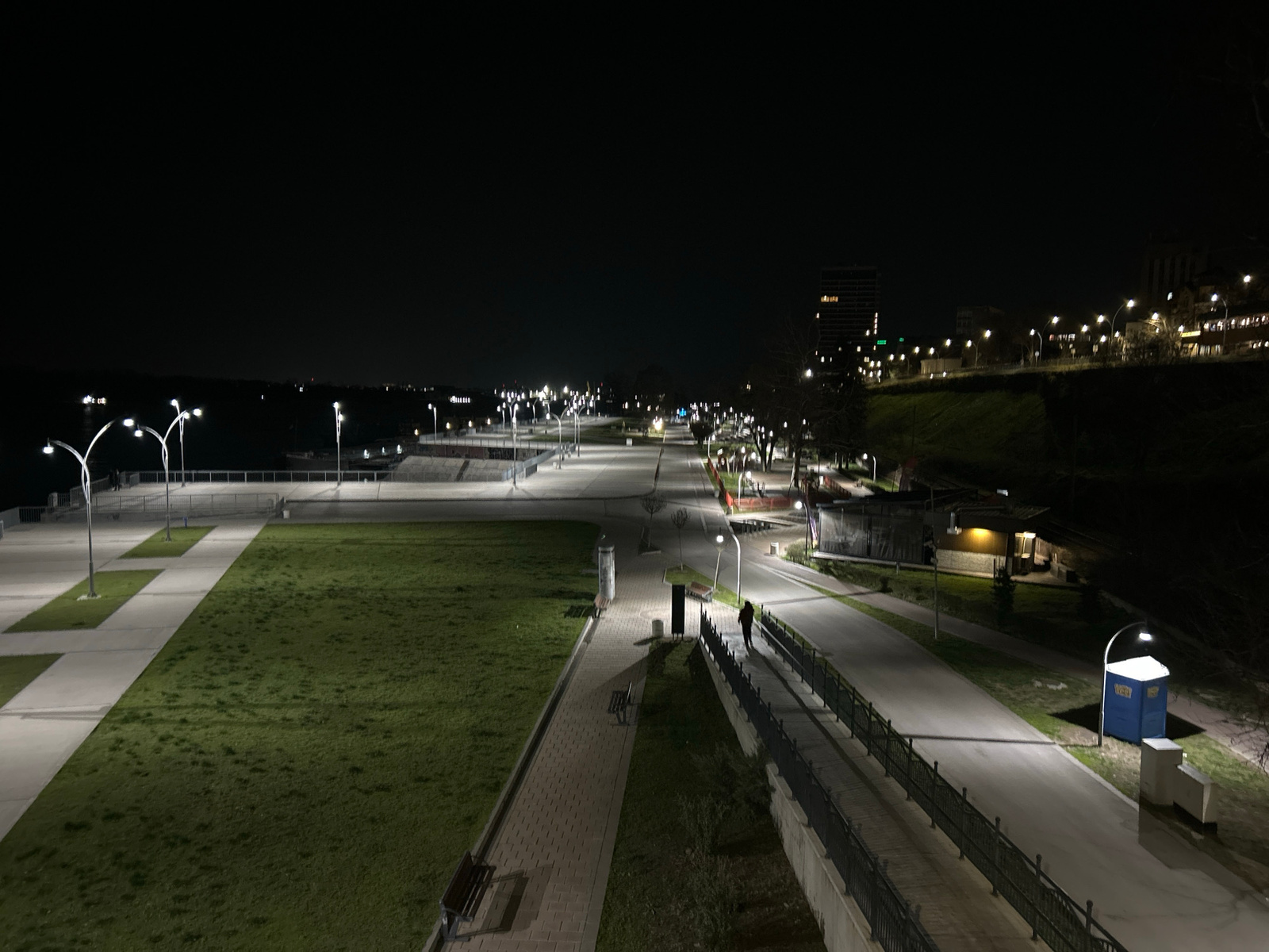 The image depicts a nighttime scene of the Danube River promenade and park area in Ruse, Bulgaria, viewed from an elevated vantage point looking generally northeast. The sky is dark and clear, illumin…read more