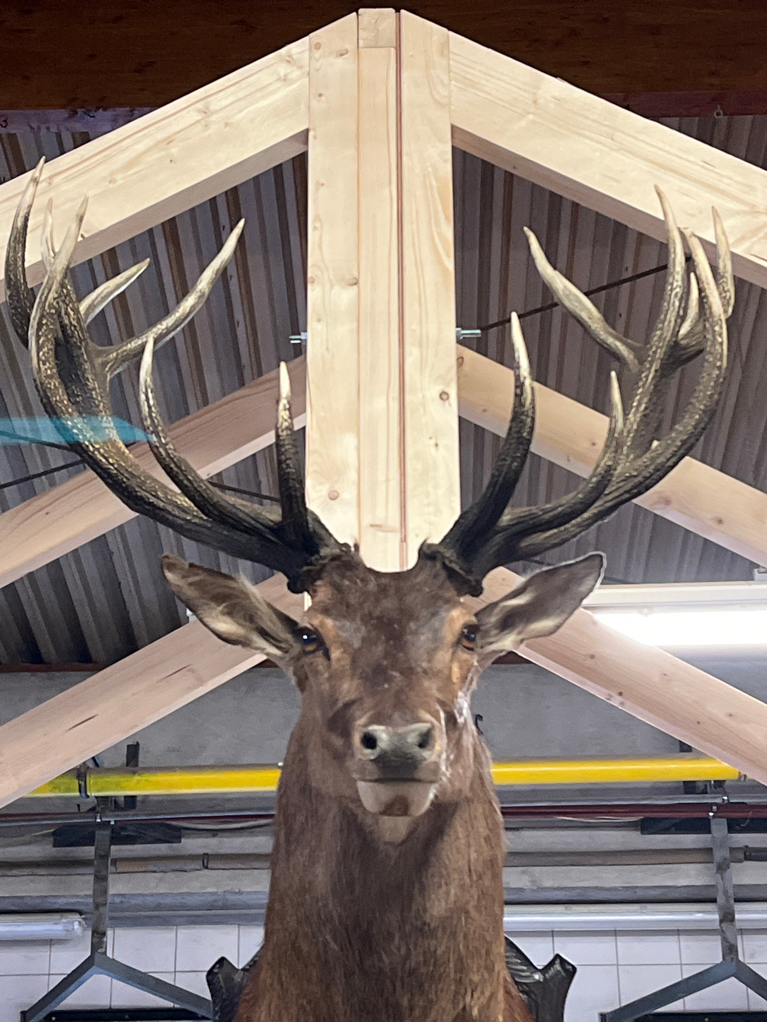 The image depicts a mounted deer head with large antlers, seemingly indoors, attached to a wooden beam structure. The antlers extend upwards and downwards. The head faces the right side of the frame.…read more