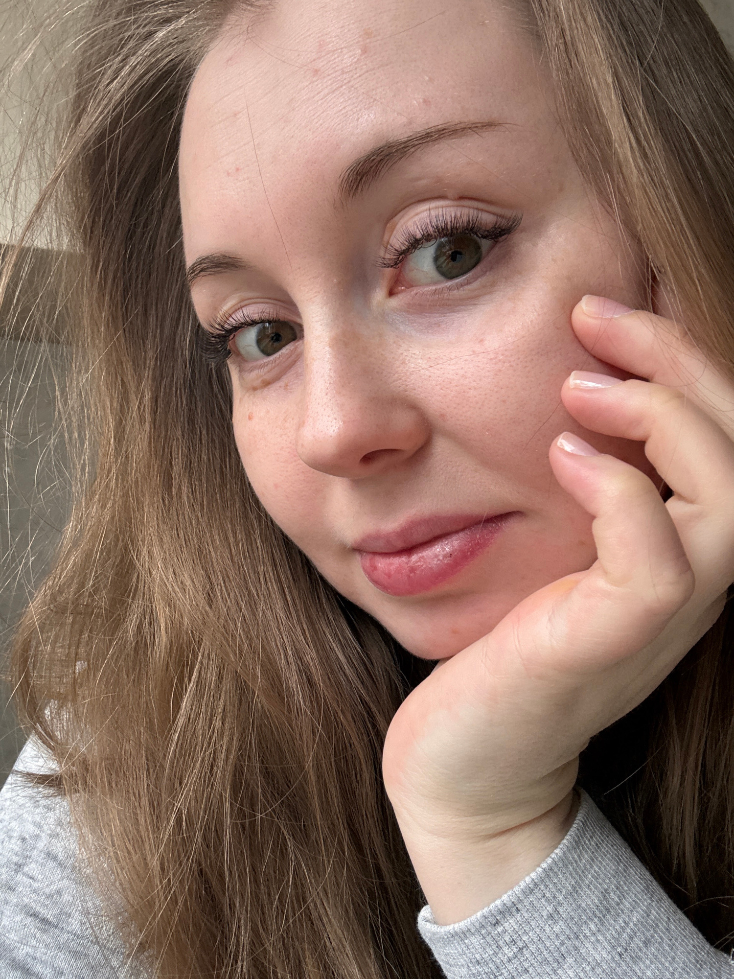 A close-up, angled view features a young woman's face, framed by light brown hair. She has fair skin, green eyes accentuated with dark eyelashes, and pink lips. Her right hand partially covers her fac…read more