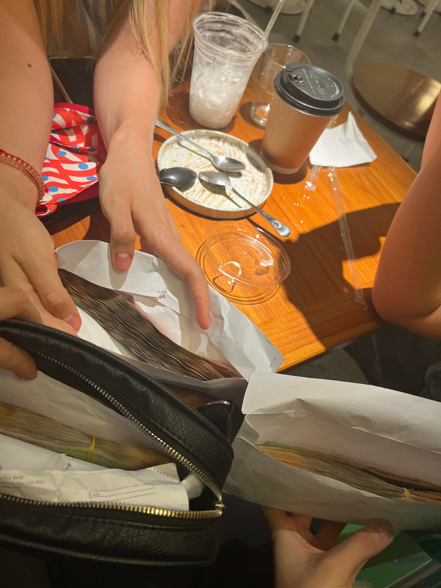 A table in a cafe setting shows used coffee cups, dirty spoons, and dessert plates, indicating a recent meal. Two people are present; one is putting stacks of Vietnamese currency (likely Vietnamese Dong) wrapped in paper and secured with rubber bands into a black purse. The location appears to be in Thủ Đức, Vietnam, based on currency visible in the purse. | Open Wire