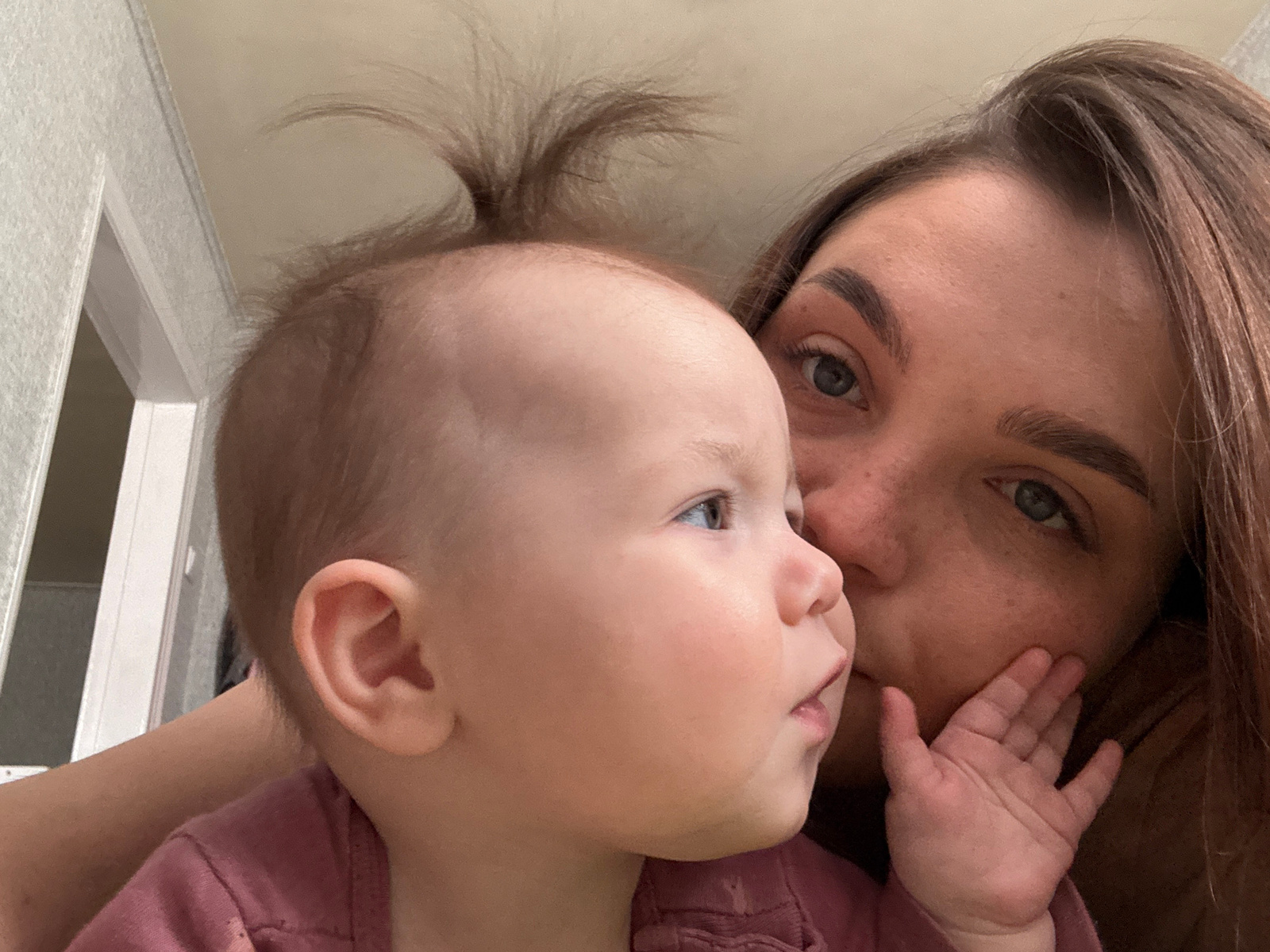 A selfie image captures a woman and a young child in close proximity. The woman, with brown hair and visible freckles, is looking directly at the camera. The child is positioned near her face with a h…read more