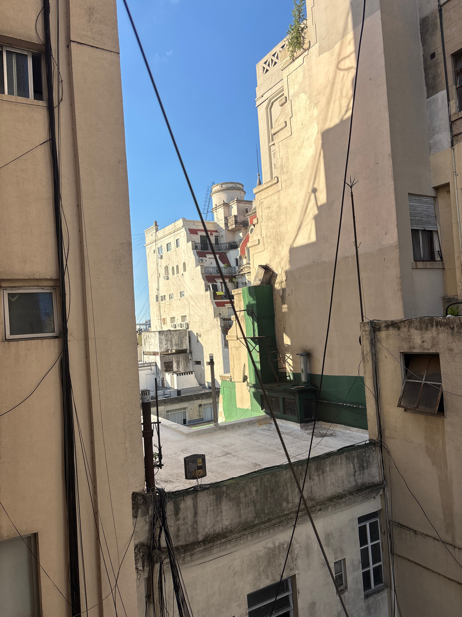 View of building exteriors in Buenos Aires, Argentina. Low-angle shot showing a narrow gap between buildings, revealing other structures and a patch of blue sky. Buildings are mostly beige and white,…read more