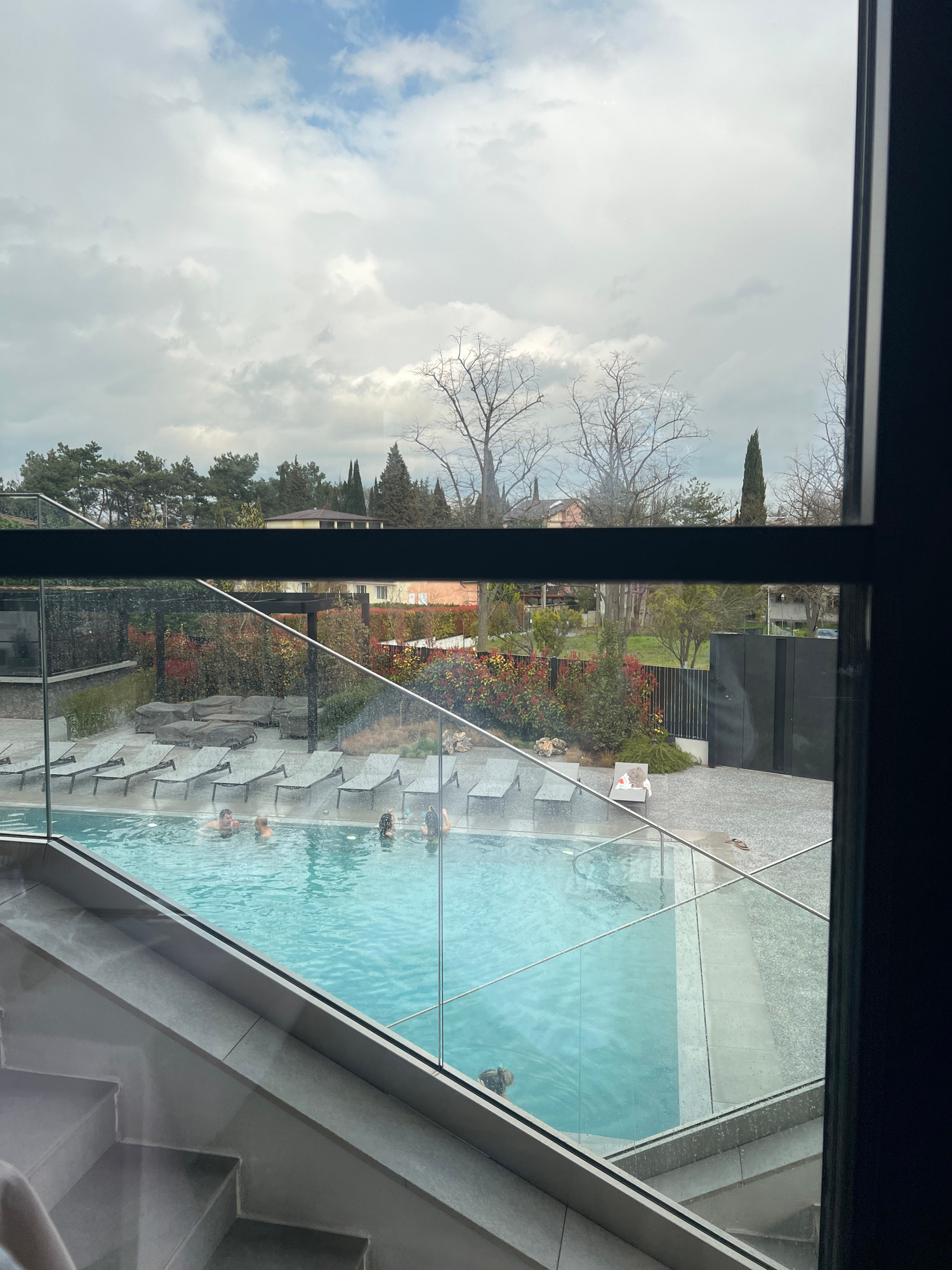 The view from a window shows a cloudy sky, trees, foliage, a building, and a pool with people in it. The pool is surrounded by lounge chairs and stonework. The location may be near Burgas, Bulgaria.