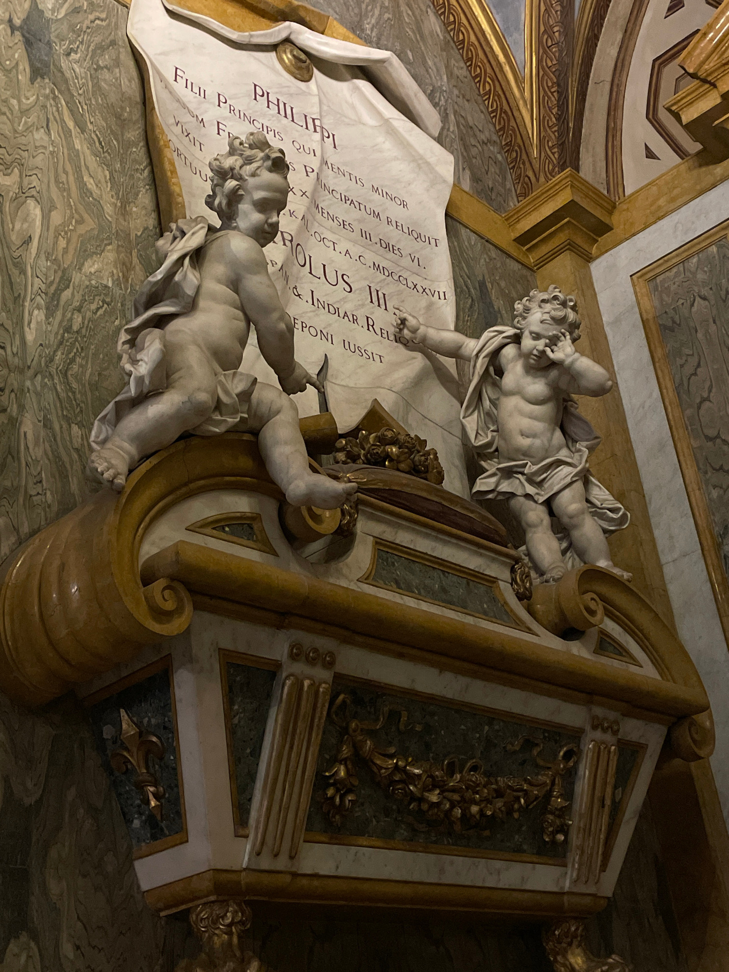 The image displays a detailed section of a funerary monument located within the Royal Chapel of the Treasure of San Gennaro, situated in the Duomo di Napoli (Naples Cathedral), Naples, Italy. The mon…read more