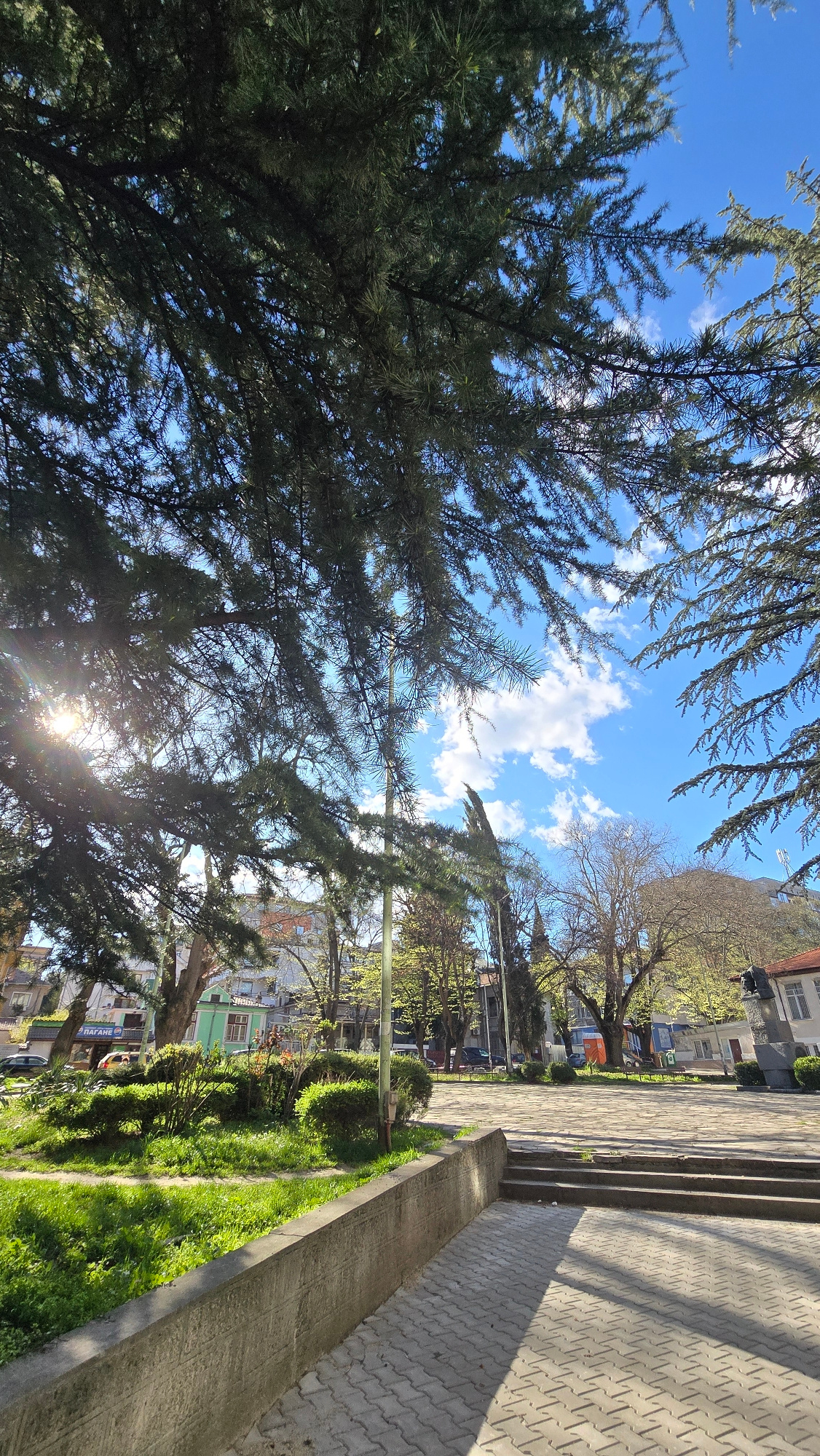The image depicts a park scene in Stara Zagora, Bulgaria. The foreground is dominated by the dense foliage of coniferous trees, obscuring a clear view of the sky, which is visible in patches with whit…read more