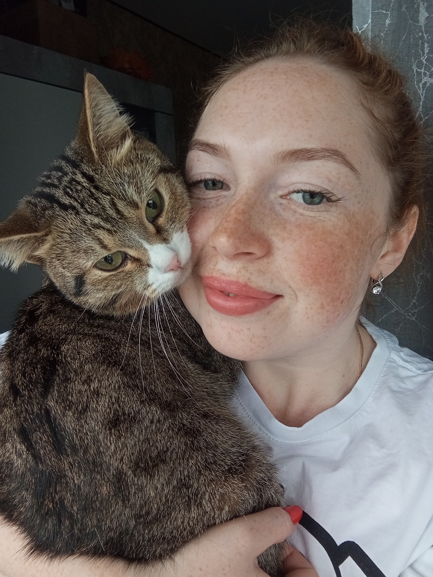 A woman and a cat are pictured in a close-up, overhead shot. The woman is lying on her back, wearing a white t-shirt with black chevron details on the shoulder. She has freckles, light eyebrows, and fâŚread more