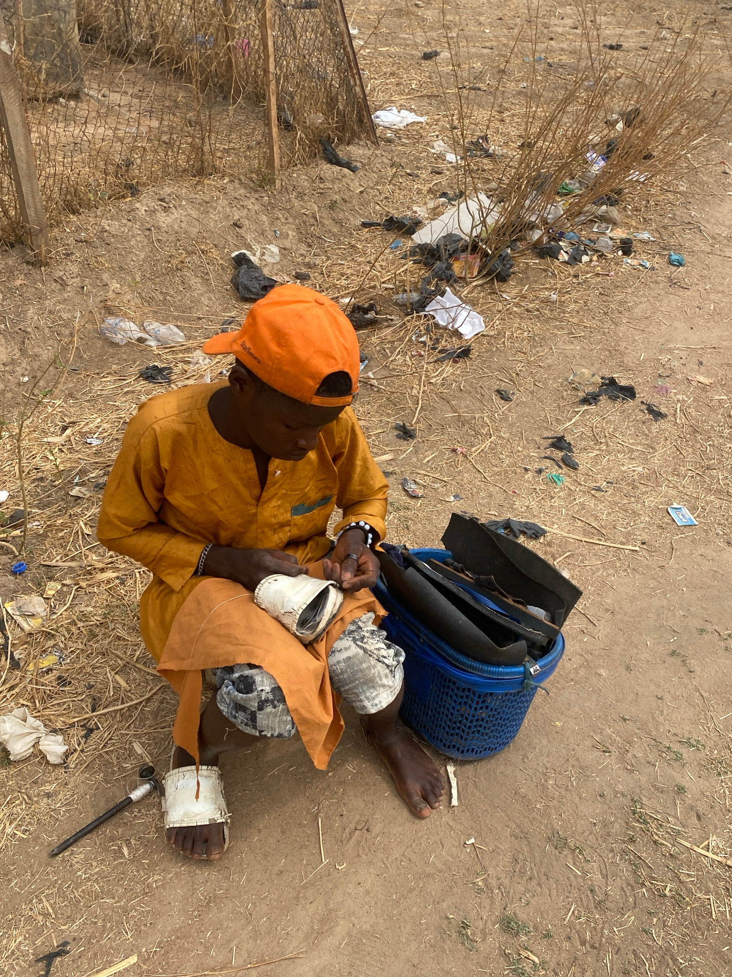 The image shows a man sitting on the ground in Rido, Nigeria. He is wearing an orange cap and shirt, and patterned pants. He appears to be mending shoes or sandals. A blue basket sits behind him, cont…read more