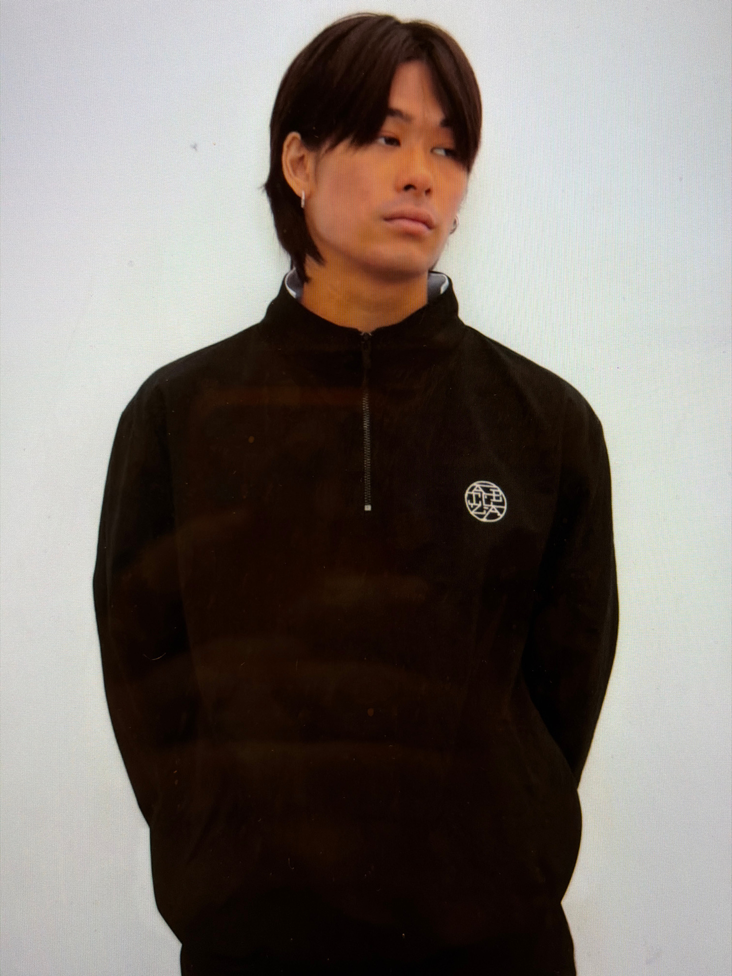 A person is laying down on a white surface. The person has short dark hair and is wearing a black shirt with a zipper at the neck and a logo on the left chest. The person is looking up and to the left…read more