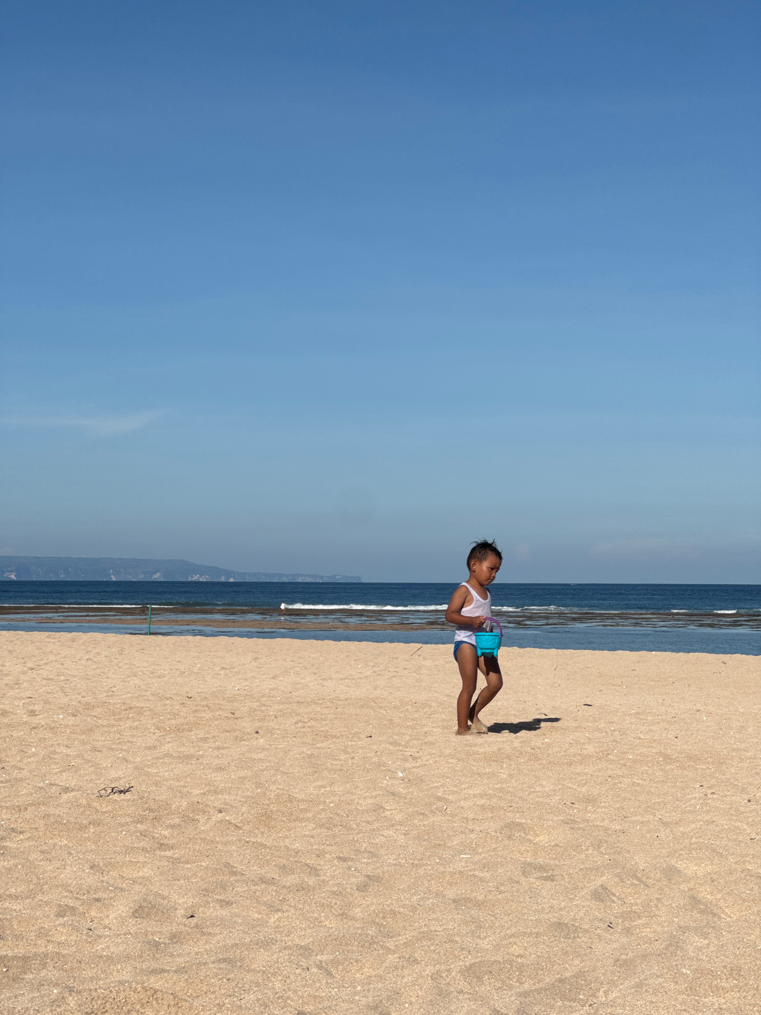 The image shows a child standing on a sandy beach next to the ocean in Kuta Selatan, Indonesia. The child is wearing a white tank top and blue shorts and is holding a blue bucket. The sky is clear blu…read more
