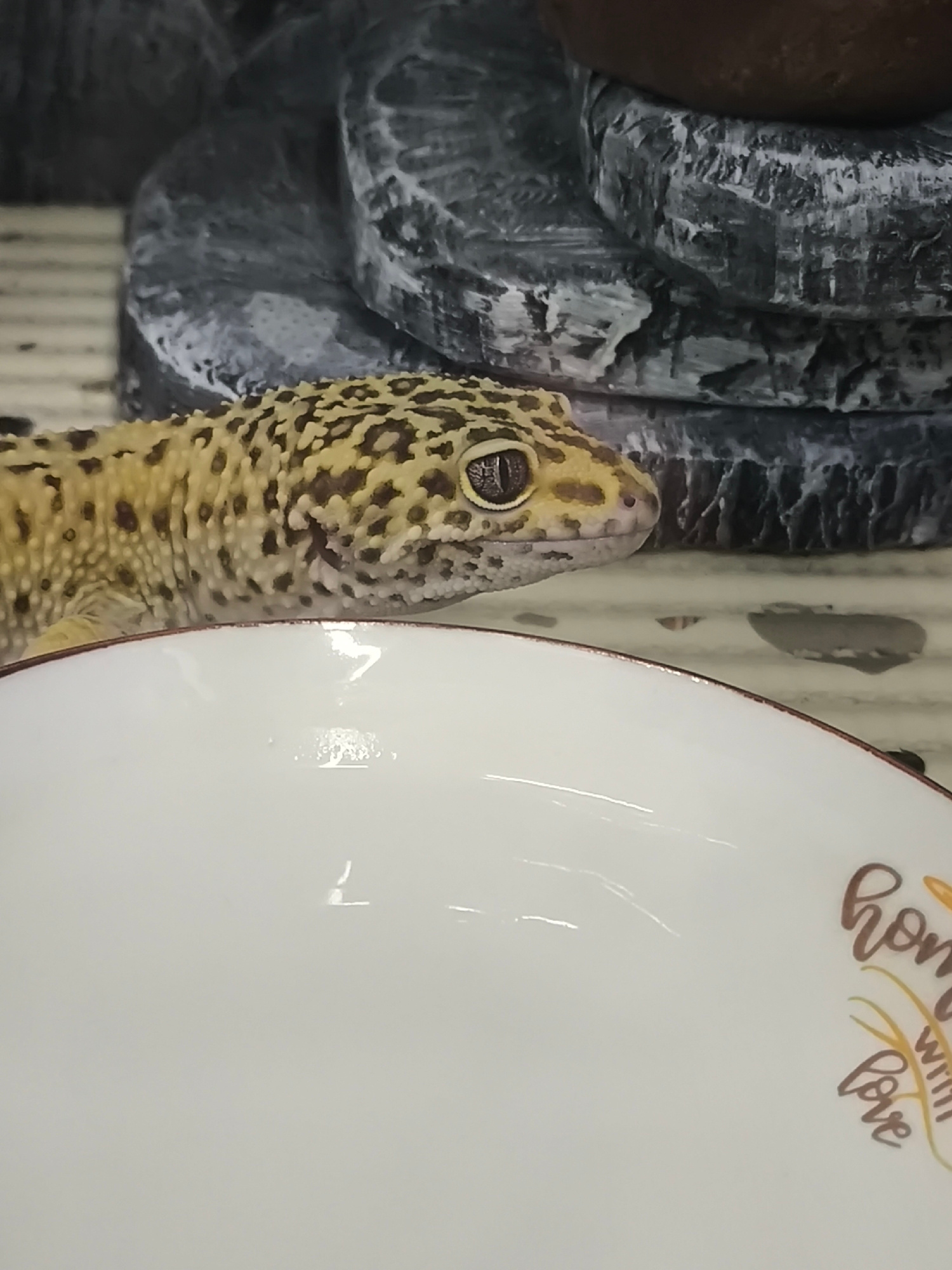 A leopard gecko is positioned near a white bowl, likely in a domestic setting. The bowl is adorned with the phrase "home with love" inscribed on the right side of the frame. Behind the gecko and bowl,…read more