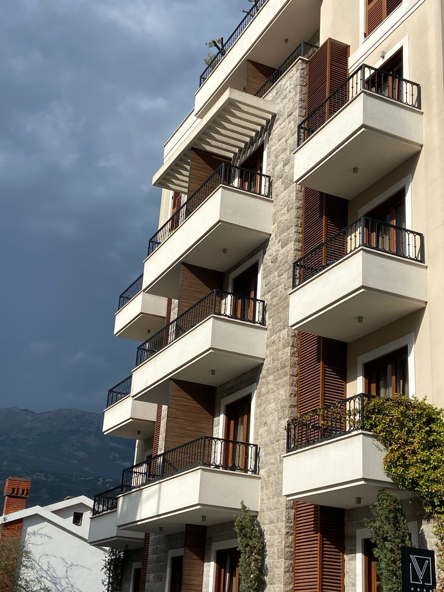 A building with a modern design is seen from below in Budva, Montenegro. The structure has protruding balconies with white walls and dark railings. Between the balconies are horizontal wood-paneled se…read more