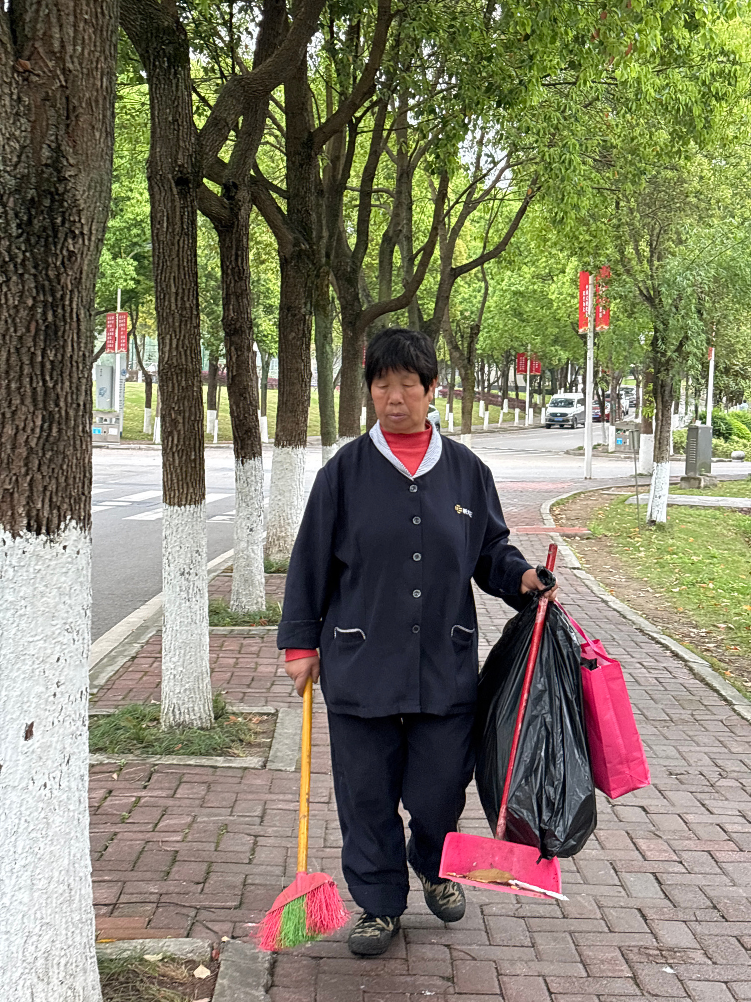 A person stands on a brick walkway alongside a tree-lined street in what appears to be Jiangjin, China. The individual is wearing a dark blue uniform-like jacket over a red shirt and dark pants. They…read more