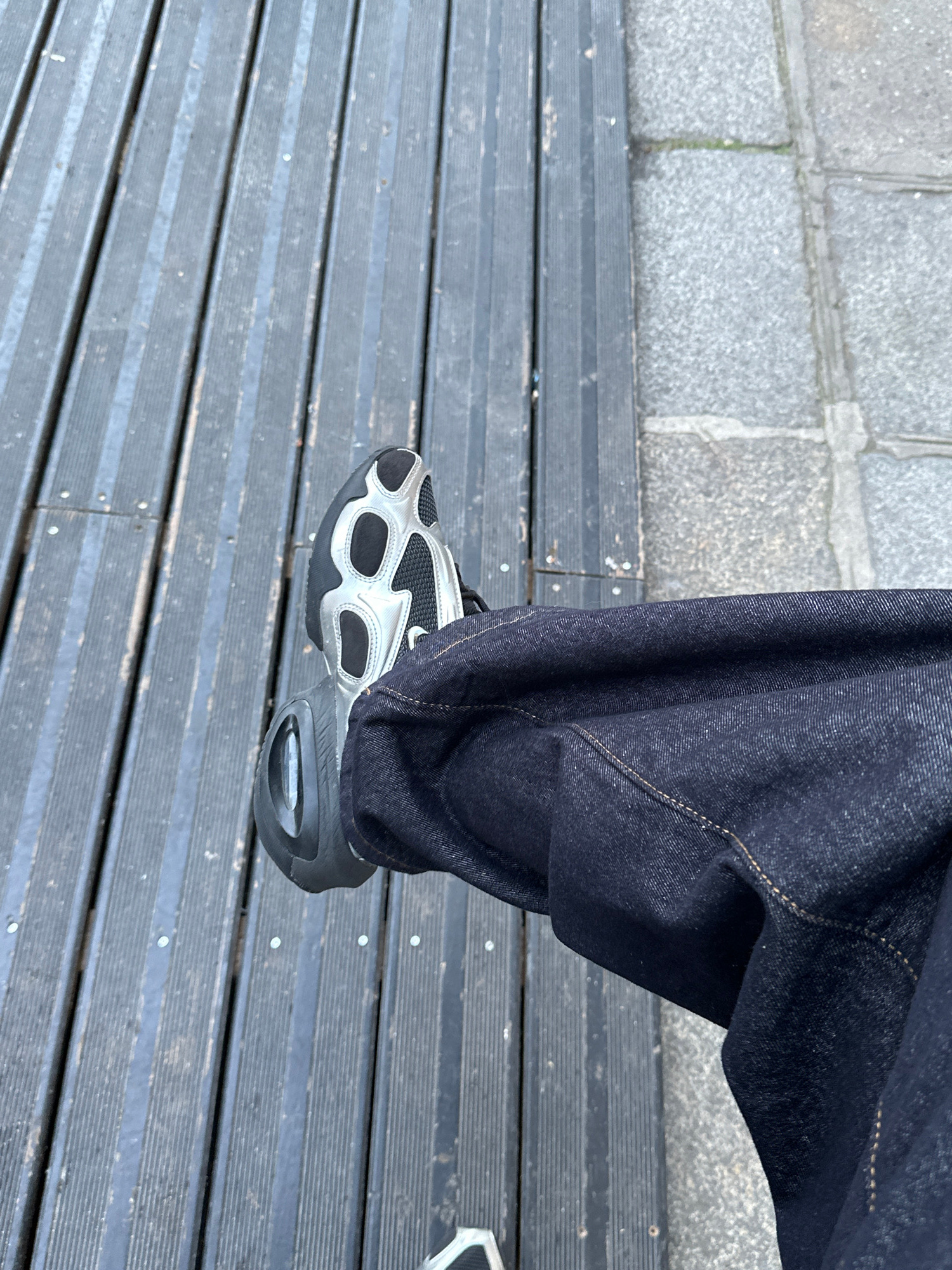 A medium shot captures a person's lower body, specifically the left foot wearing a silver and black athletic shoe. The person is clad in dark denim pants. The subject is on a wooden boardwalk or walkwβ¦read more