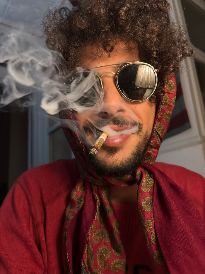 A person with curly hair and round sunglasses, wearing a red patterned headscarf, holds a lit cigarette in their mouth, exhaling smoke. The person appears to be wearing a red sweater. The camera angle…read more