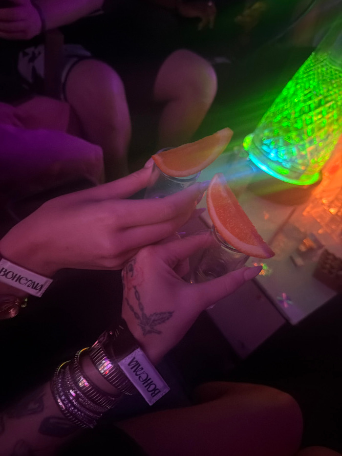 Two hands hold shot glasses garnished with orange slices in a dimly lit environment. Both wrists are adorned with numerous bangles and a wristband labeled "BOHEMIA." One hand has tattoo art. A green-l…read more