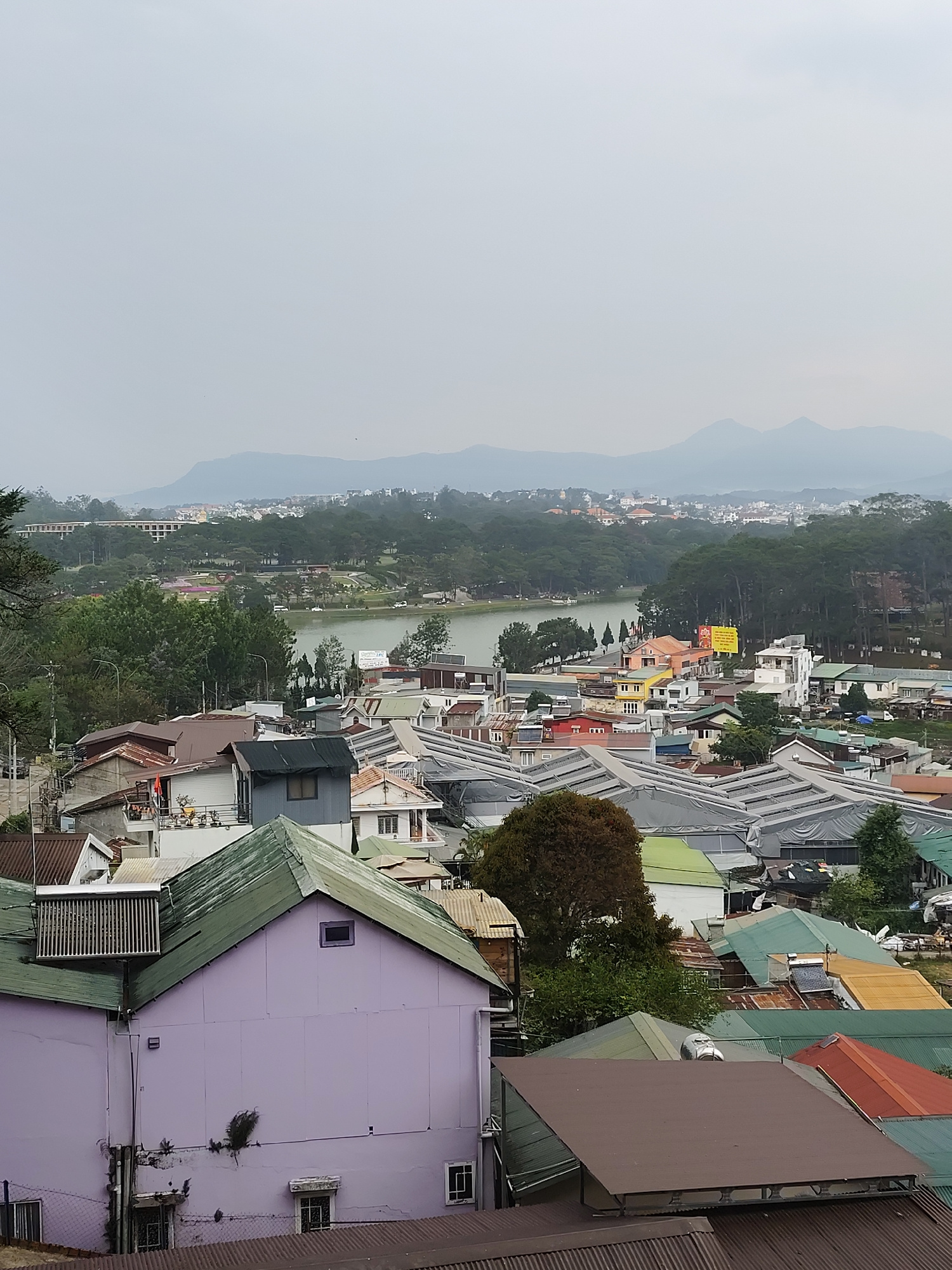 A high-angle view captures a section of Da Lat, Vietnam, under an overcast sky. A lake surrounded by trees and buildings occupies the midground, leading to distant mountains obscured by haze. The fore…read more