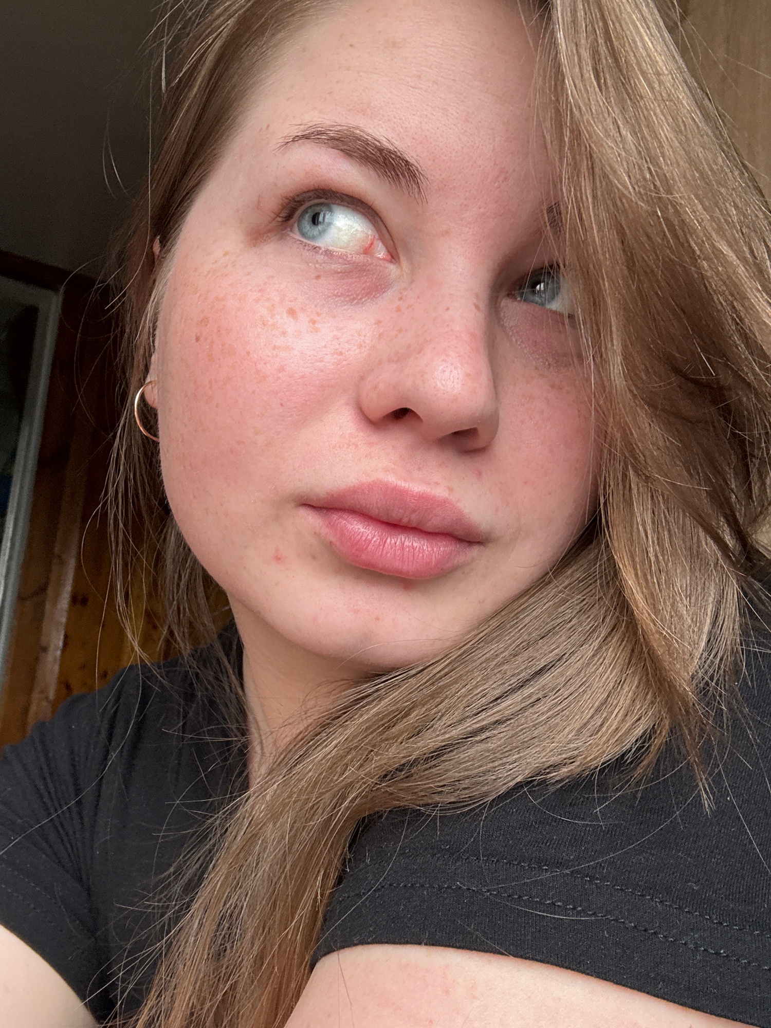 A close-up, rotated selfie of a young, fair-skinned female with light brown, layered hair. Her hair is slightly disheveled and falls across her forehead and cheek. She has light blue eyes and noticeab…read more