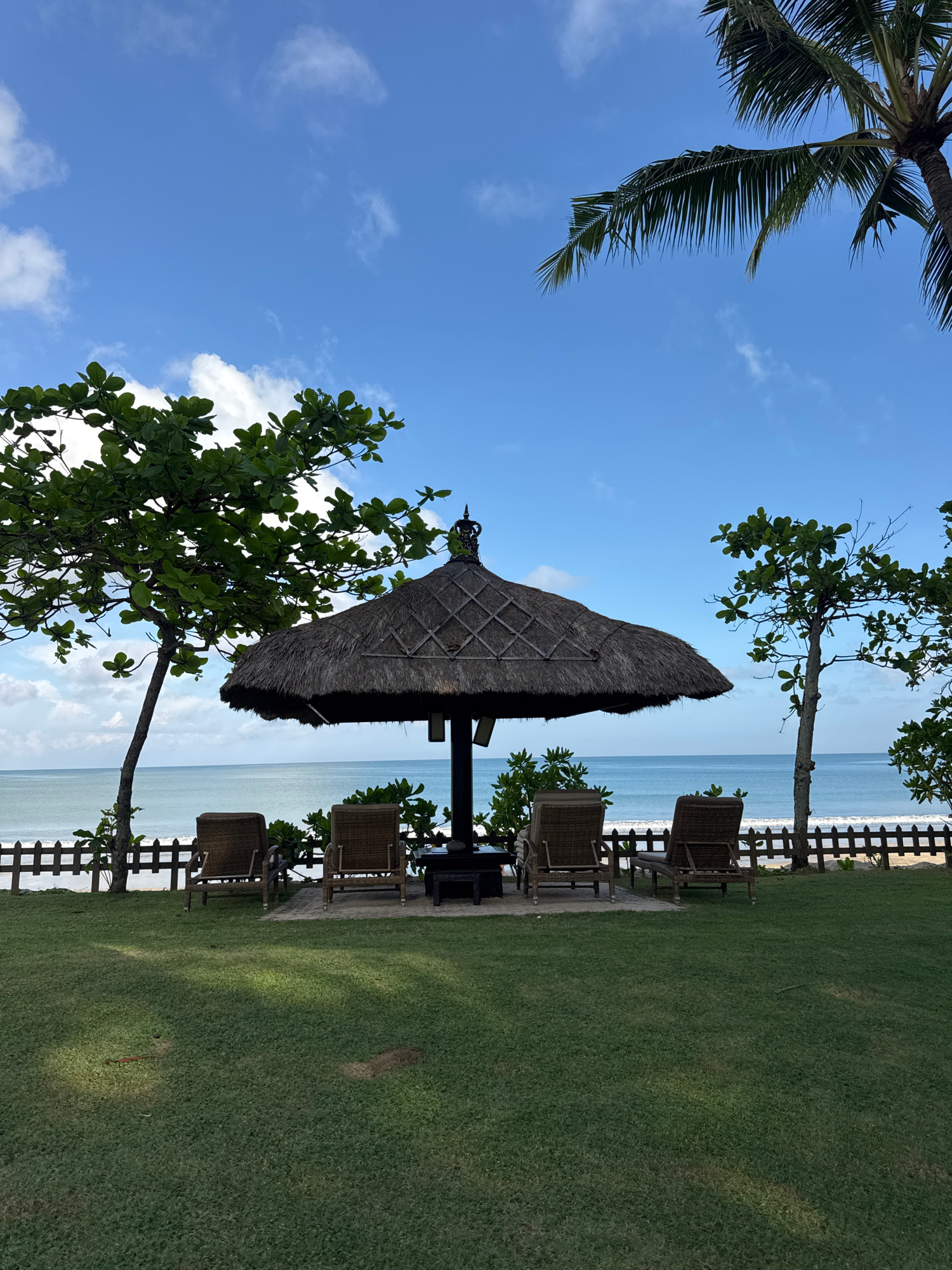 The image depicts a coastal scene, possibly in the city of Jimbaran, Indonesia. A thatched-roof structure stands near a grassy area, likely providing shade. There are four chairs near the roof. A part…read more