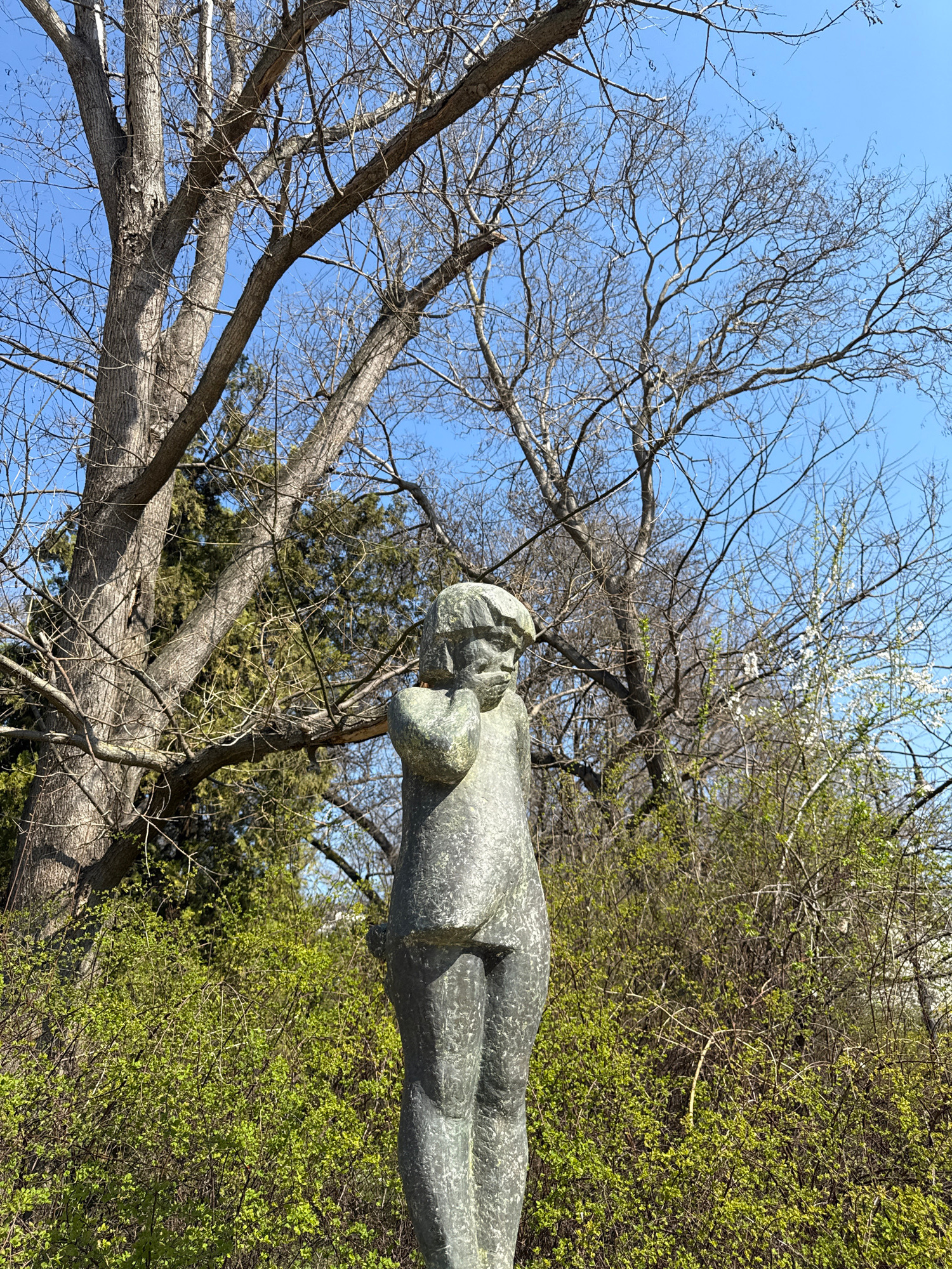The image features a bronze sculpture of a reclining nude female figure, positioned outdoors against a backdrop of trees and a blue sky. The trees include bare branches and green foliage, suggesting a…read more