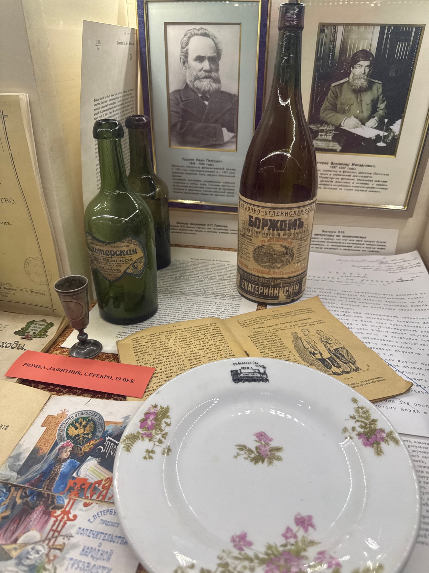 This indoor scene presents a collection of historical items. There are two framed black and white portraits, one of a man with a beard writing at a desk, and another of a man with a beard in a suit. T…read more