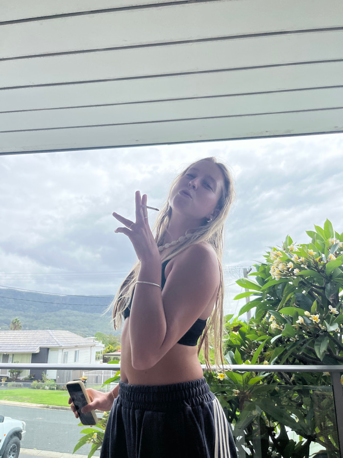 A young female stands on a balcony in Bulli, Australia. She has long blonde hair and is wearing a black crop top and dark blue athletic shorts with white side stripes. She wears a shell necklace, a th…read more