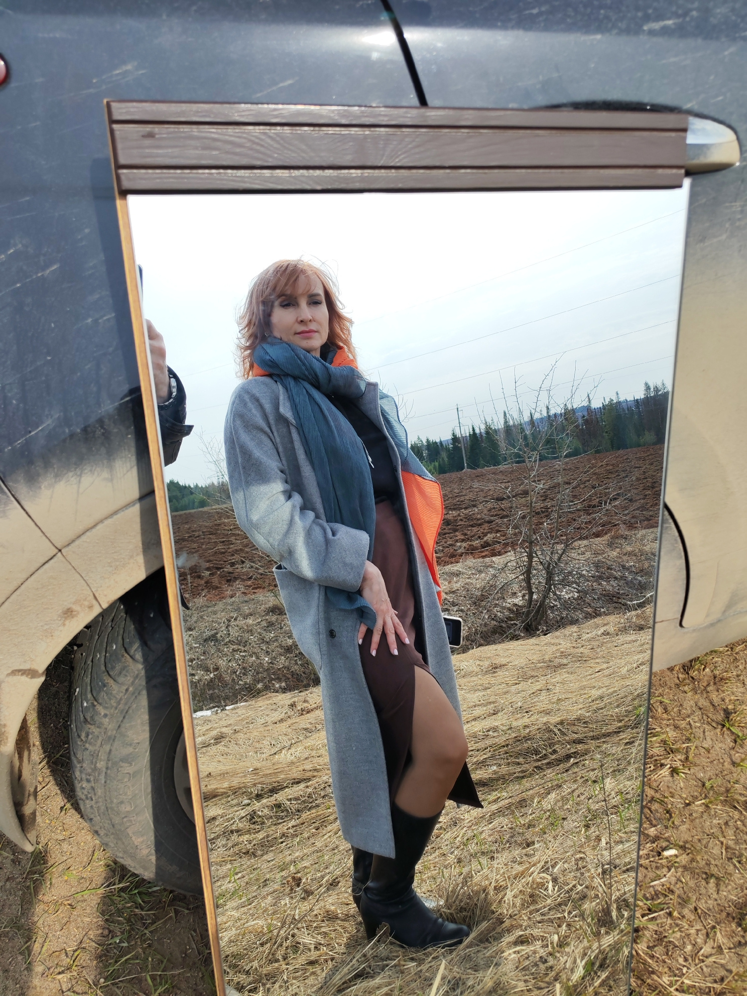 A woman is reflected in a mirror propped against a dark-colored vehicle. She is wearing a grey coat, a dark blue scarf, and black boots. She has reddish-brown hair. The mirror reflects a rural landsca…read more