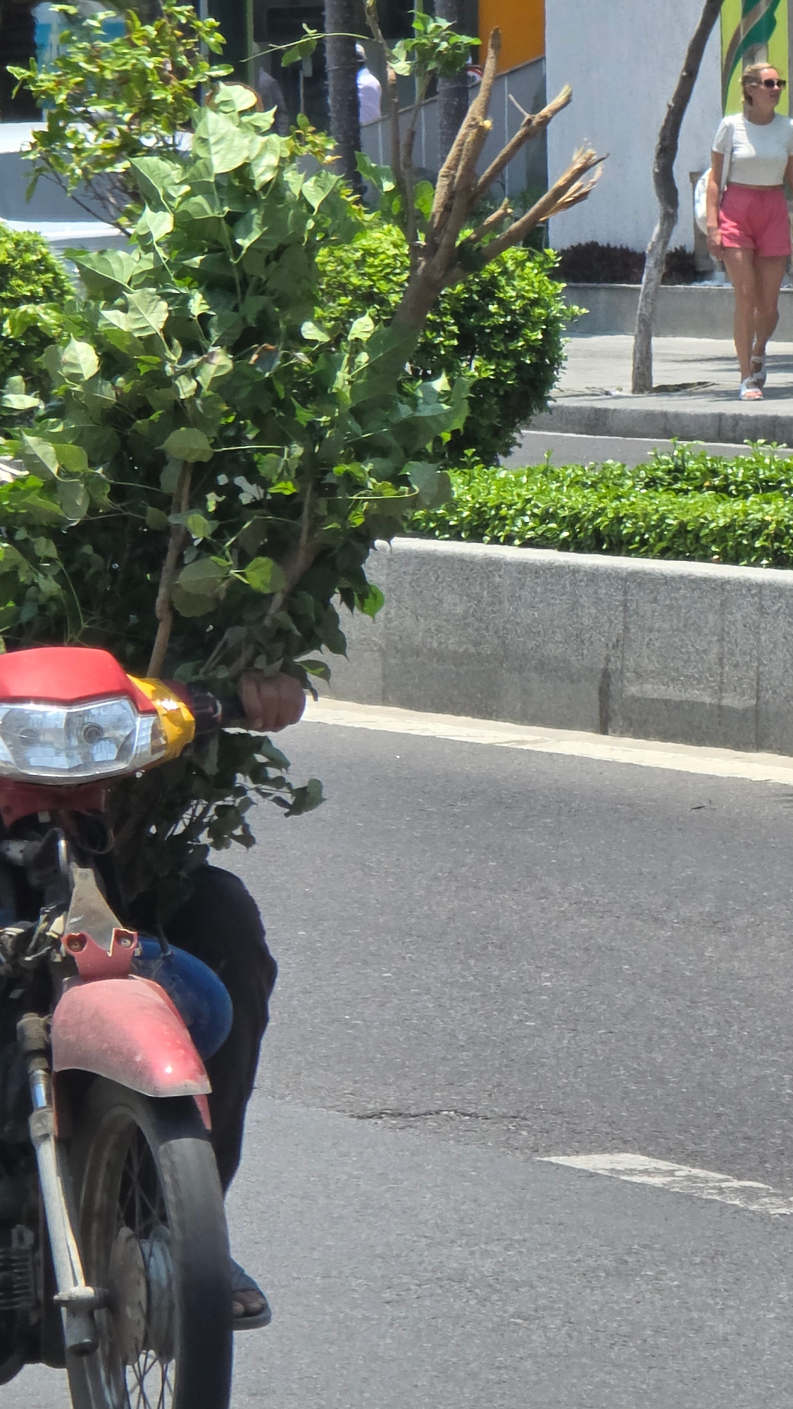 The image shows a motor scooter on a paved city street in Nha Trang, Vietnam. A man is operating the motor scooter, which is carrying a large tree with trimmed branches and foliage. A person wearing p…read more