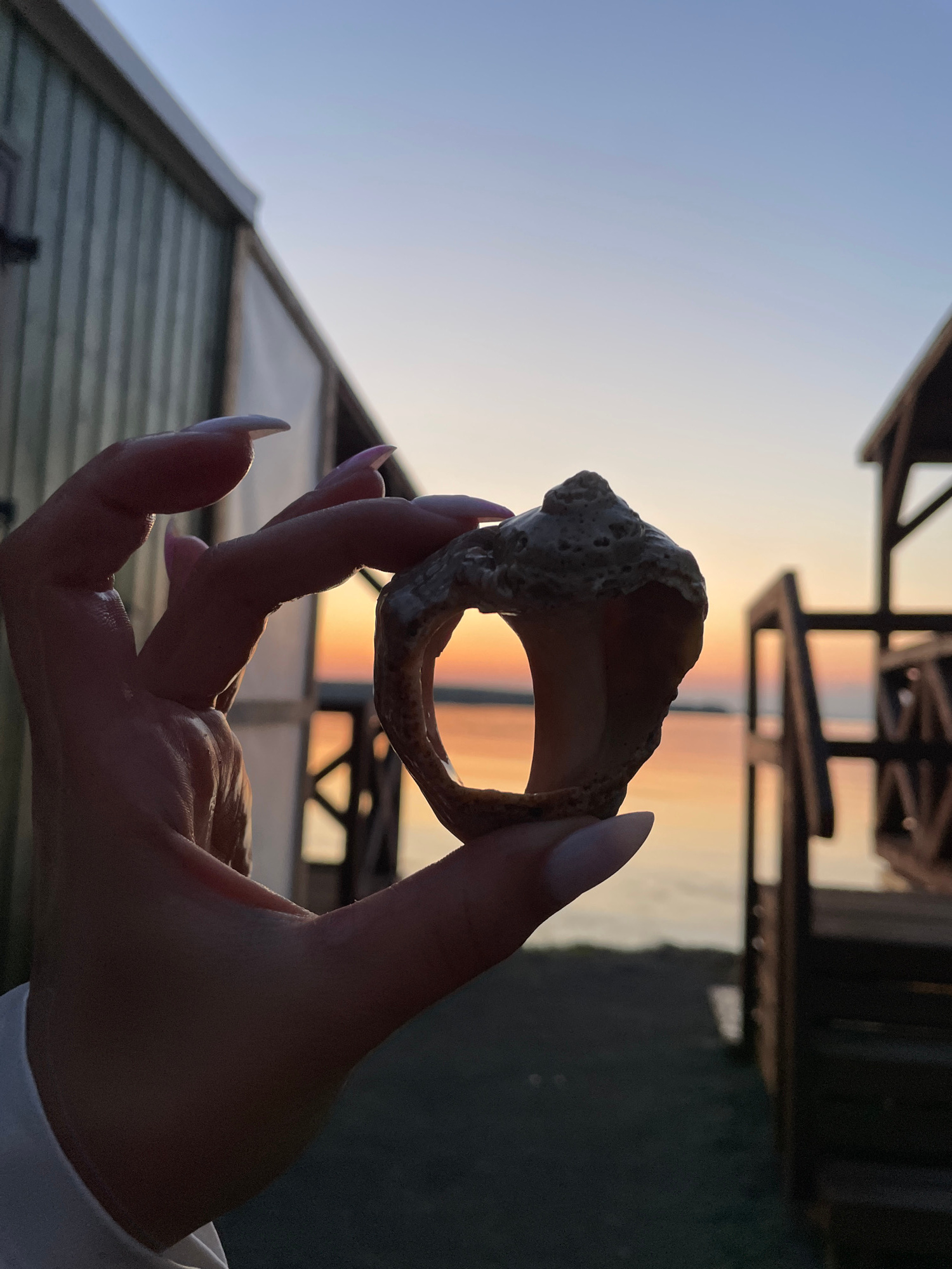 A hand holding a conch shell is in focus, positioned against a sunset-lit background of a body of water, likely a sea or lake, and wooden structures. The shell is a textured, earthy tone with a large…read more