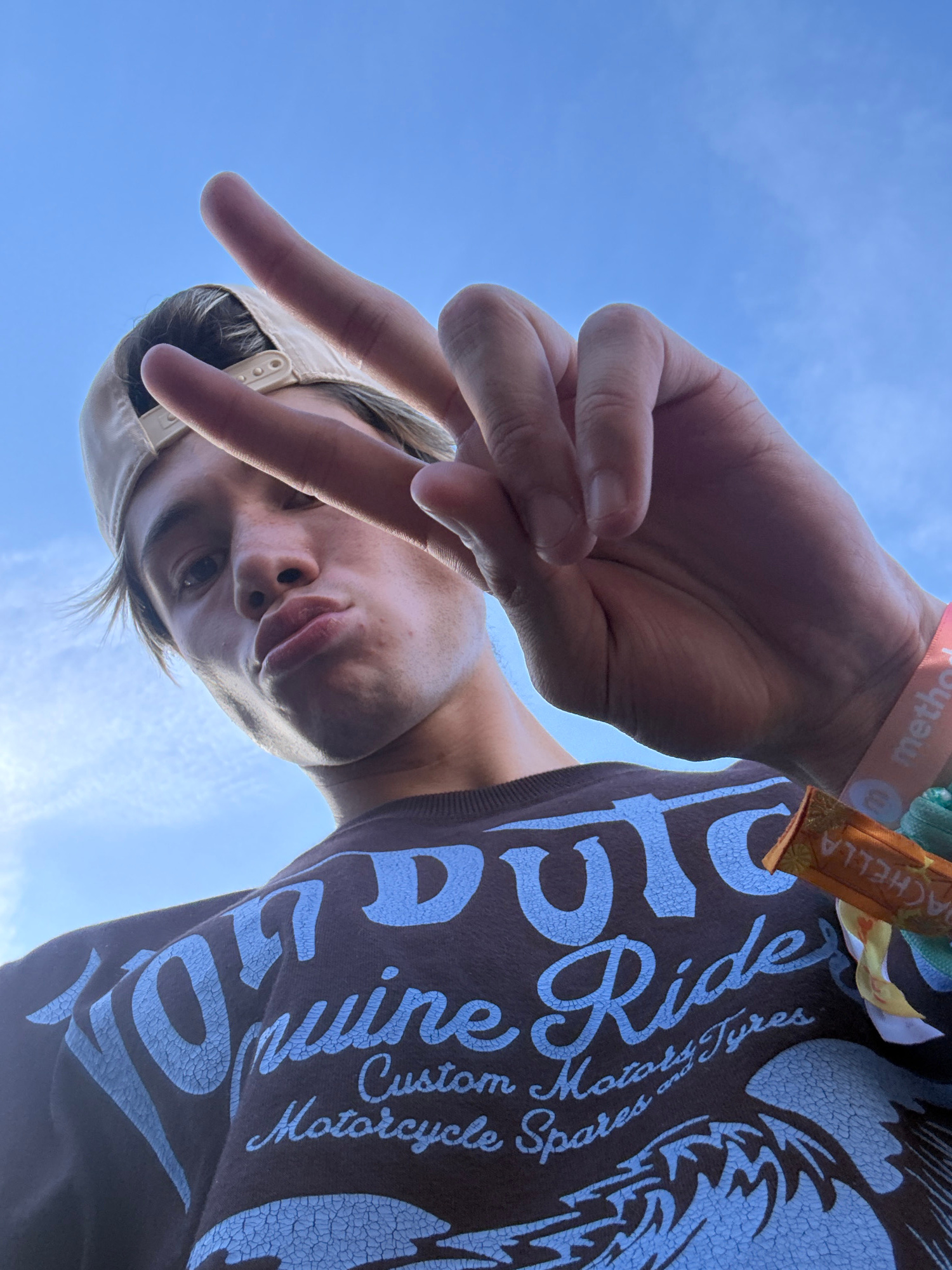 A low-angle shot looking up at a fair-skinned individual under a clear blue sky, presumably in La Quinta, California. The person is wearing a dark t-shirt with light blue text and a repeating design.…read more