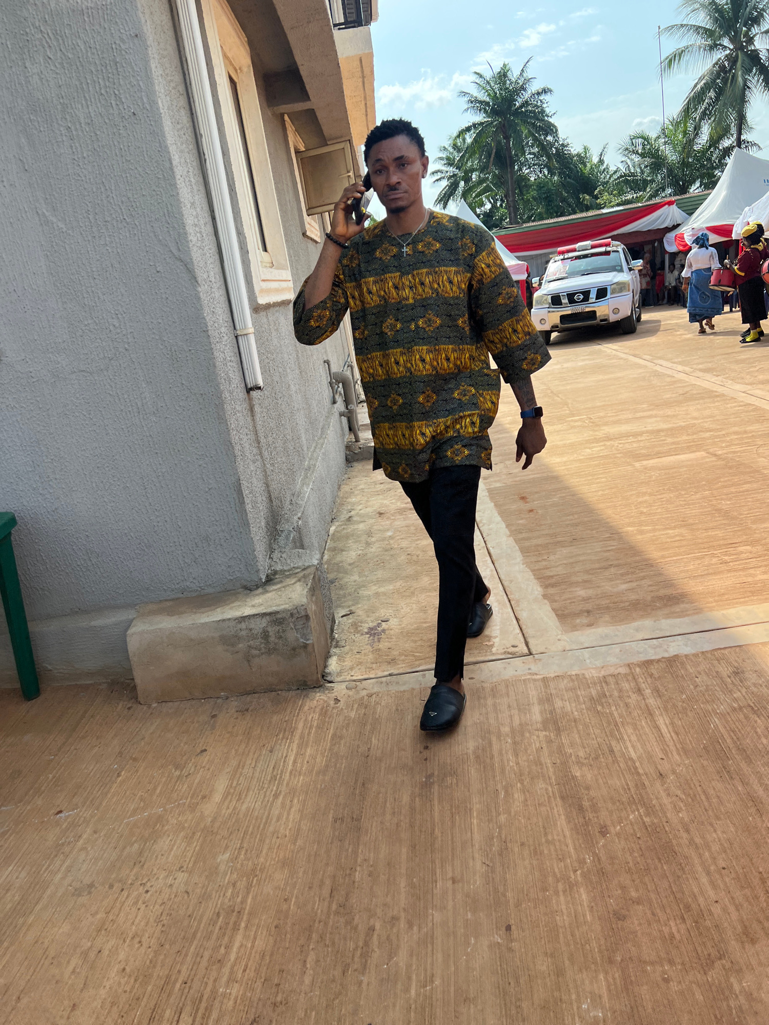 A sideways-oriented photograph captures a young man standing outdoors, centered in the foreground, against the backdrop of an event. The man, of African descent, wears a vibrant yellow, gold, and blac…read more