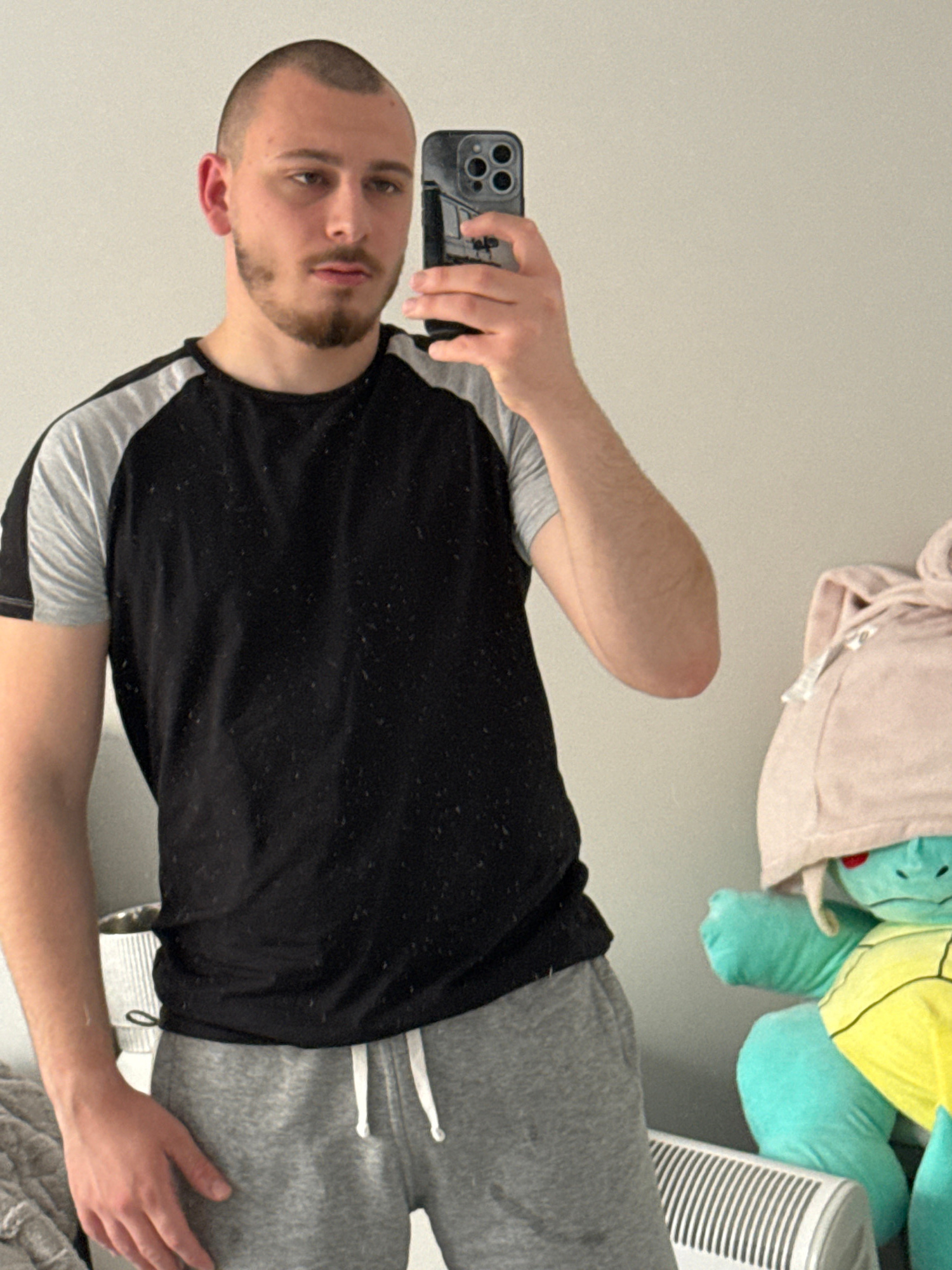 A man is taking a selfie in an indoor setting. He is wearing a black t-shirt with grey sleeves and grey sweatpants with a drawstring. He has short brown hair and a beard. He is holding a cell phone in…read more
