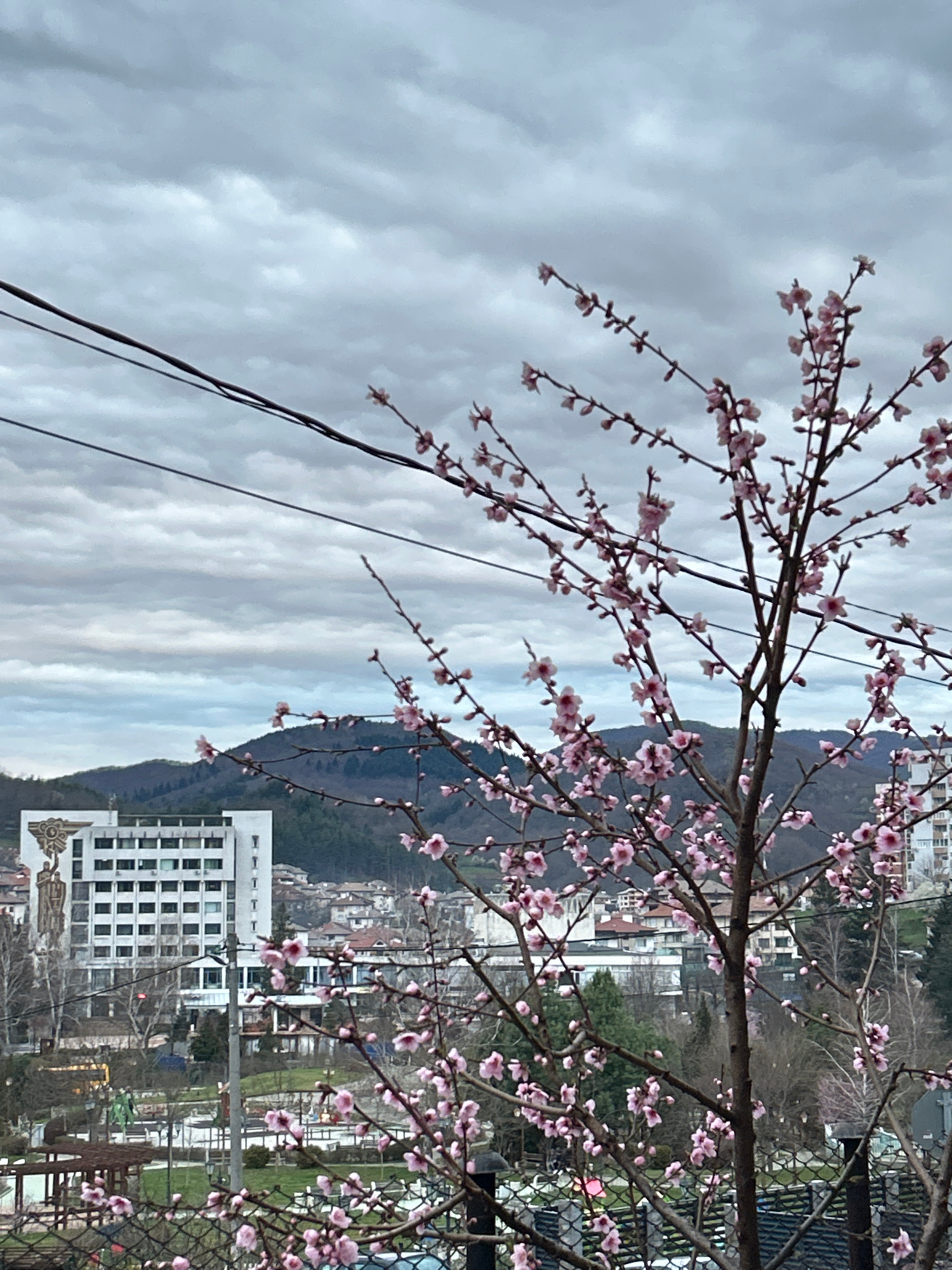 The image shows a cloudy day in Zlatograd, Bulgaria. A flowering tree with pink blossoms is in the foreground, partially obscuring the view. In the background, there is a mountain range and a cityscap…read more