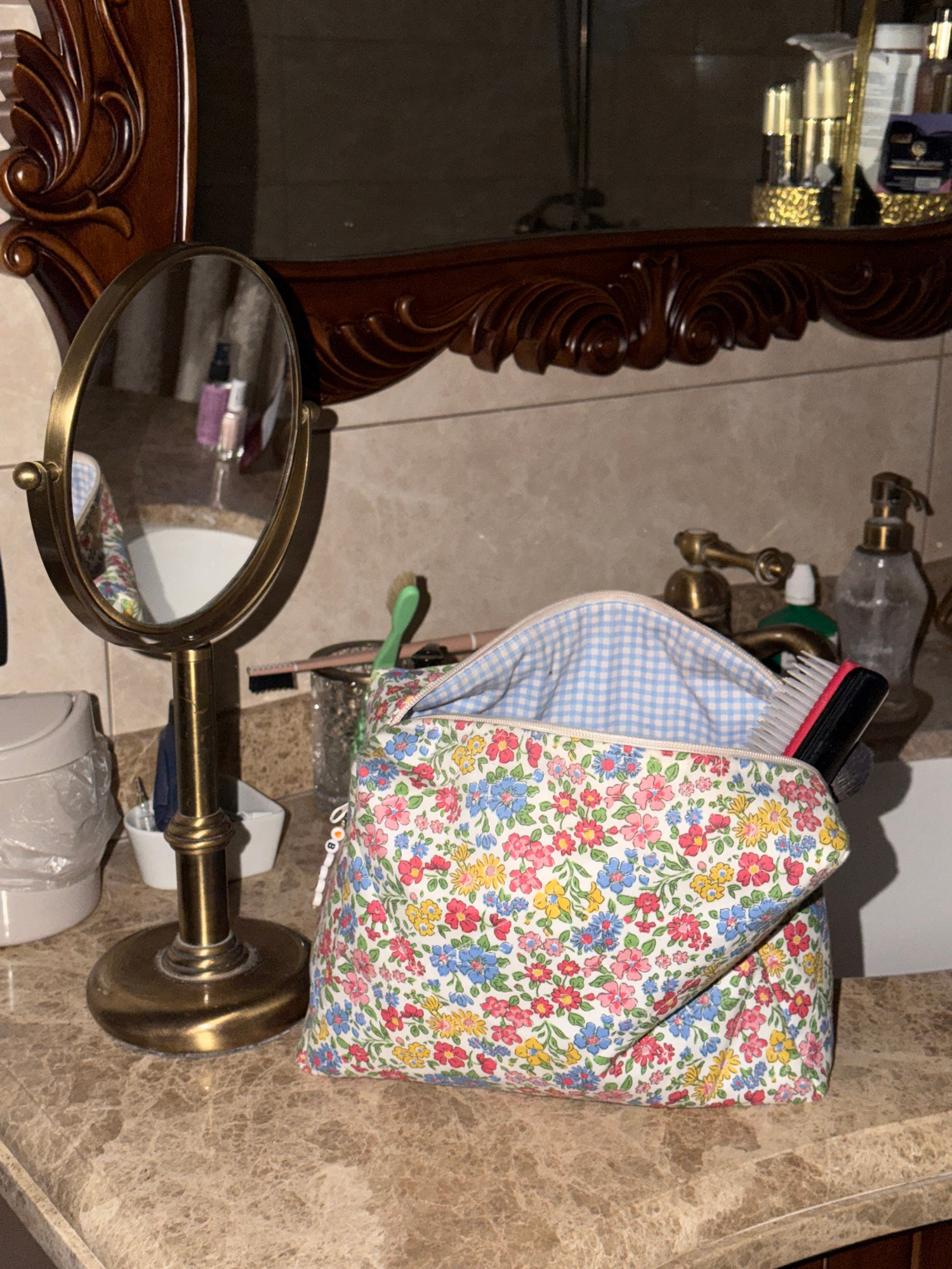 The image shows a bathroom vanity. On the right, there's a marble countertop. A floral print cosmetic bag sits near a toothbrush and a hairbrush. A bronze-colored vanity mirror is in the lower left co…read more