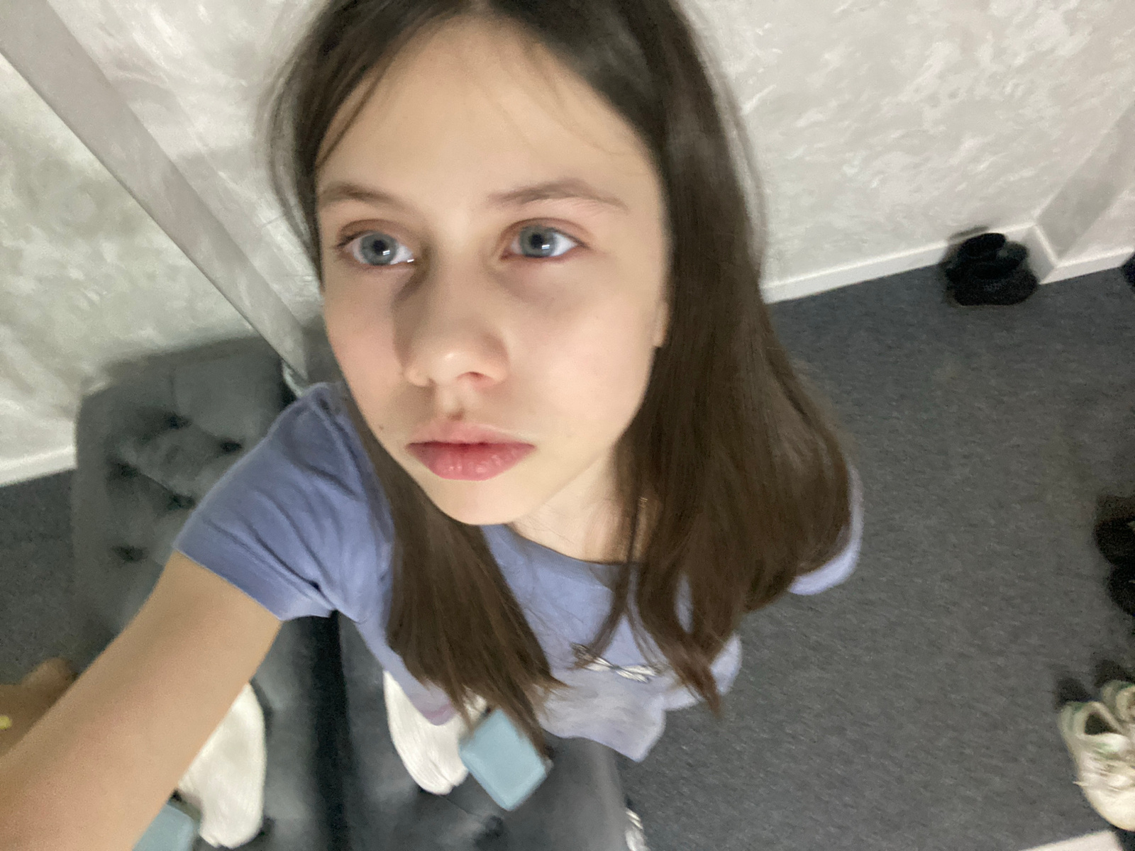 The image shows a selfie of a young woman with fair skin, light blue eyes, and long brown hair. She is wearing a light blue t-shirt. The background includes a gray carpet, part of a gray upholstered c…read more