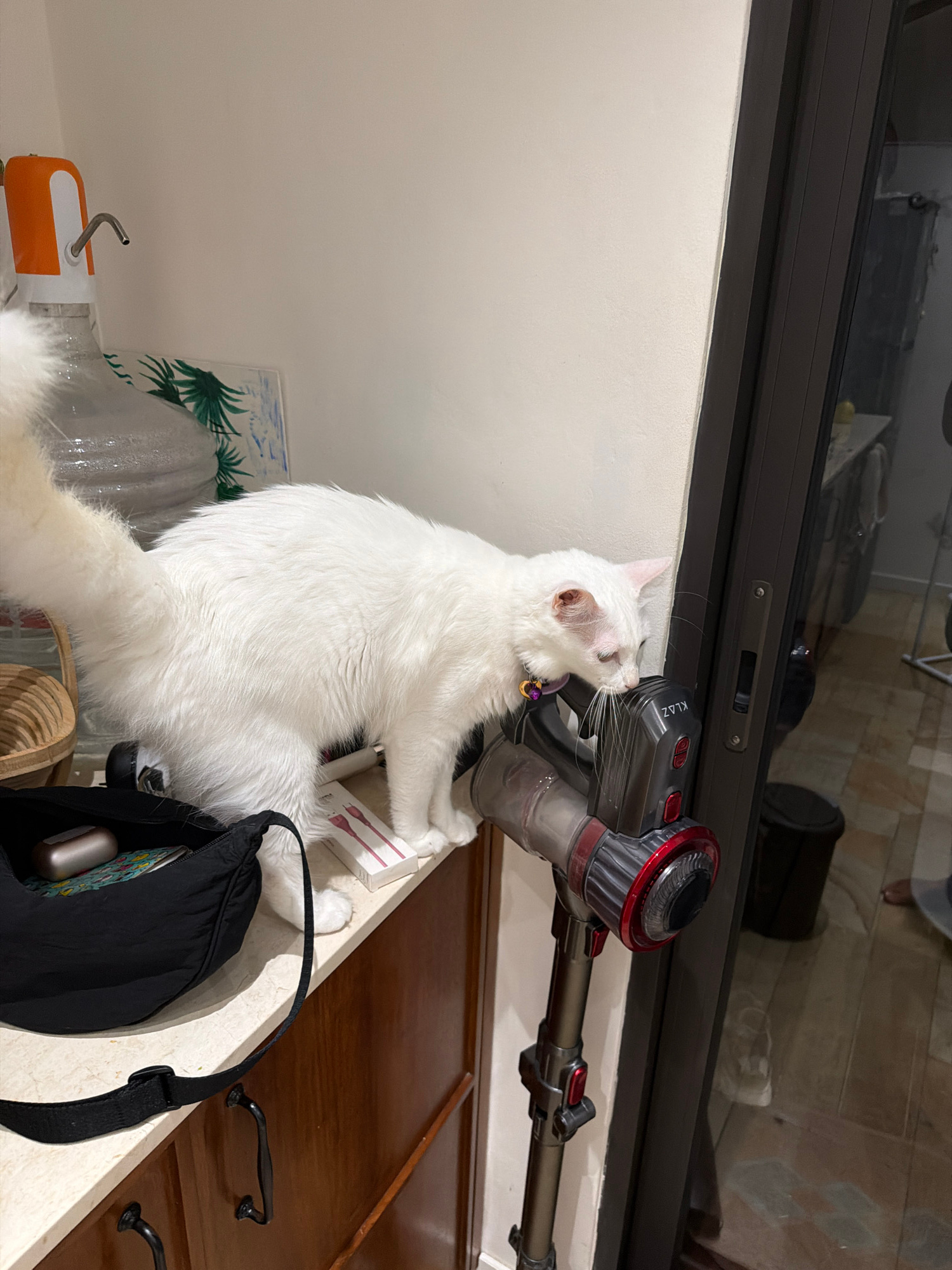 A white cat stands on a countertop next to a gray and red vacuum cleaner. The cat is facing the vacuum, with its head close to the vacuum's nozzle. A black bag with a strap is also on the counter near…read more