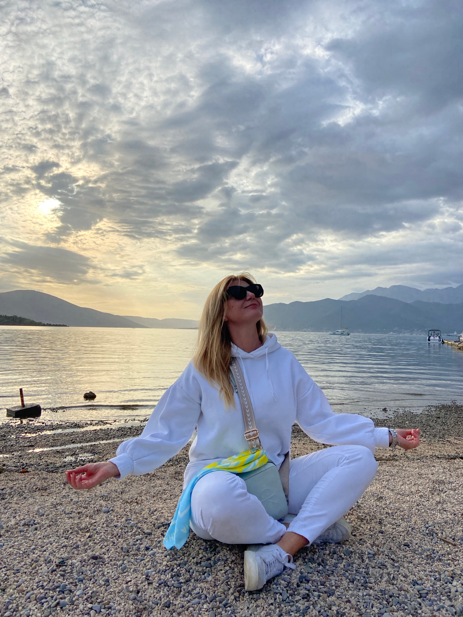 A woman is sitting on a pebble beach in Tivat, Montenegro. She is wearing white clothing, including a hoodie, pants, and sneakers, along with sunglasses. A colorful patterned bag is slung across her b…read more