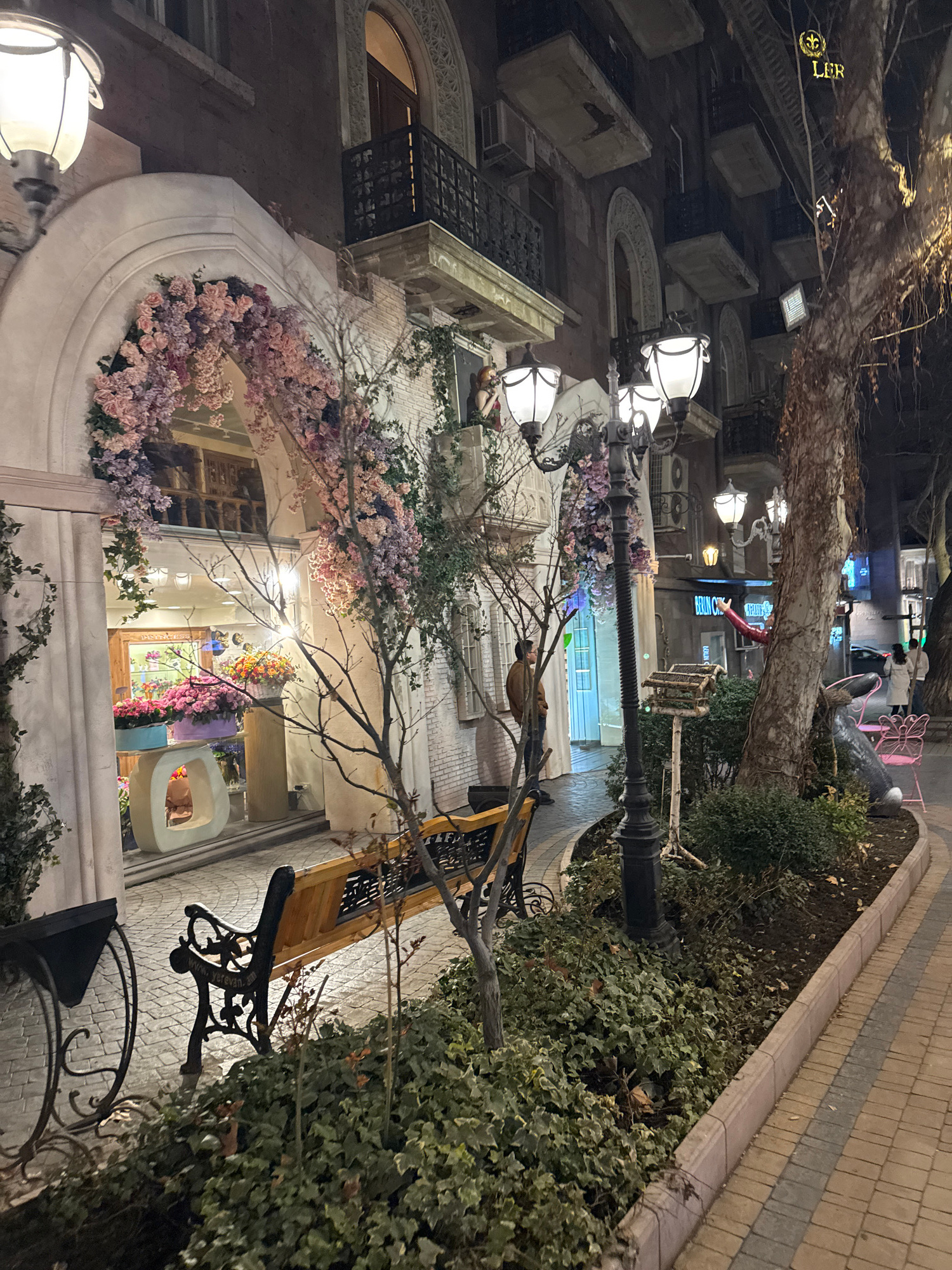 The scene depicts a well-lit urban street at night in Yerevan, Armenia. The dominant structure on the left is a multi-story building featuring a prominent ground-floor shop entrance styled as a large…read more