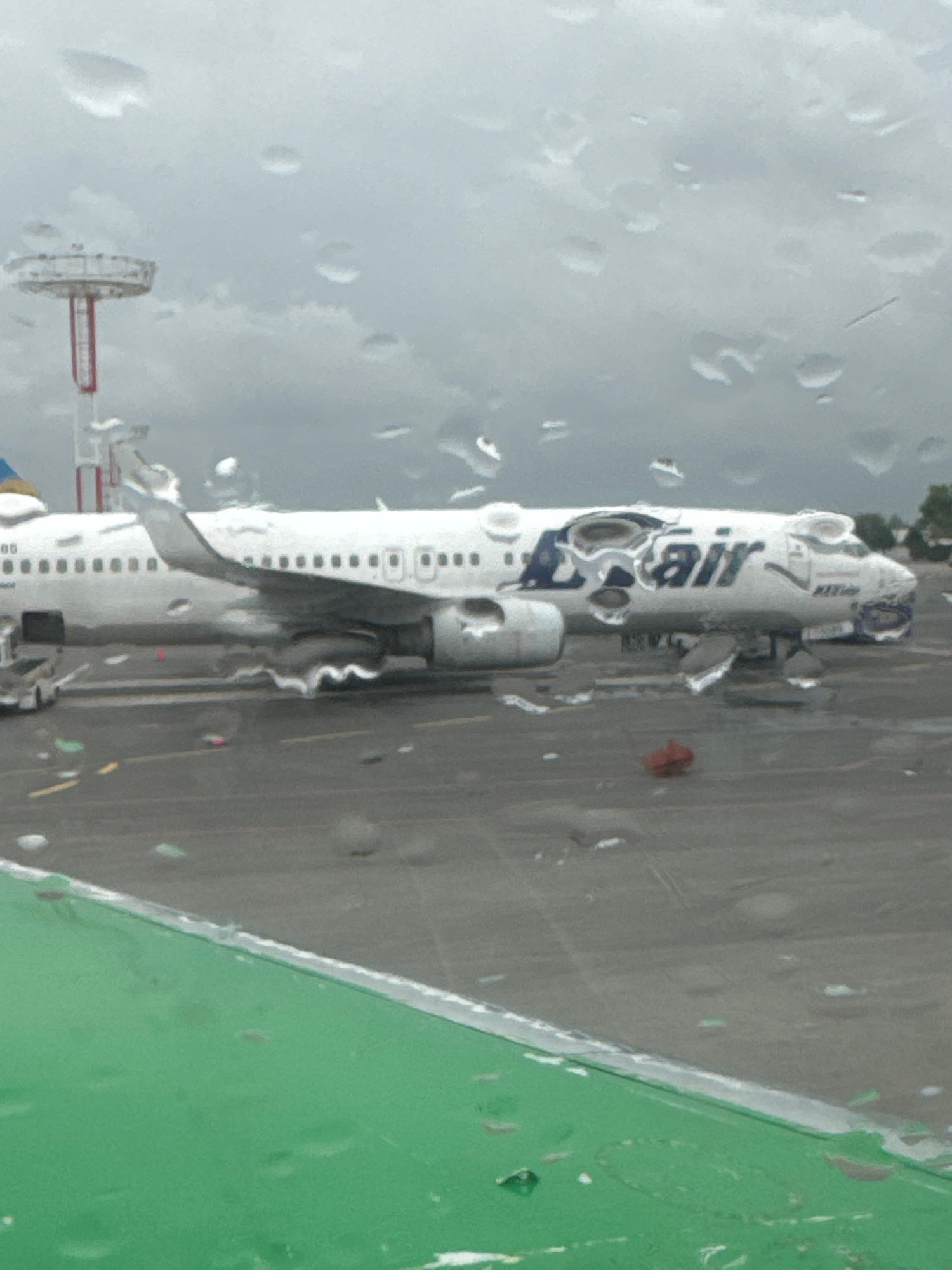 The image shows an "Uzbekistan Airways" airplane parked on an airport tarmac during a rainy day. The scene is viewed through a raindrop-covered window. In the background, a control tower and other air…read more
