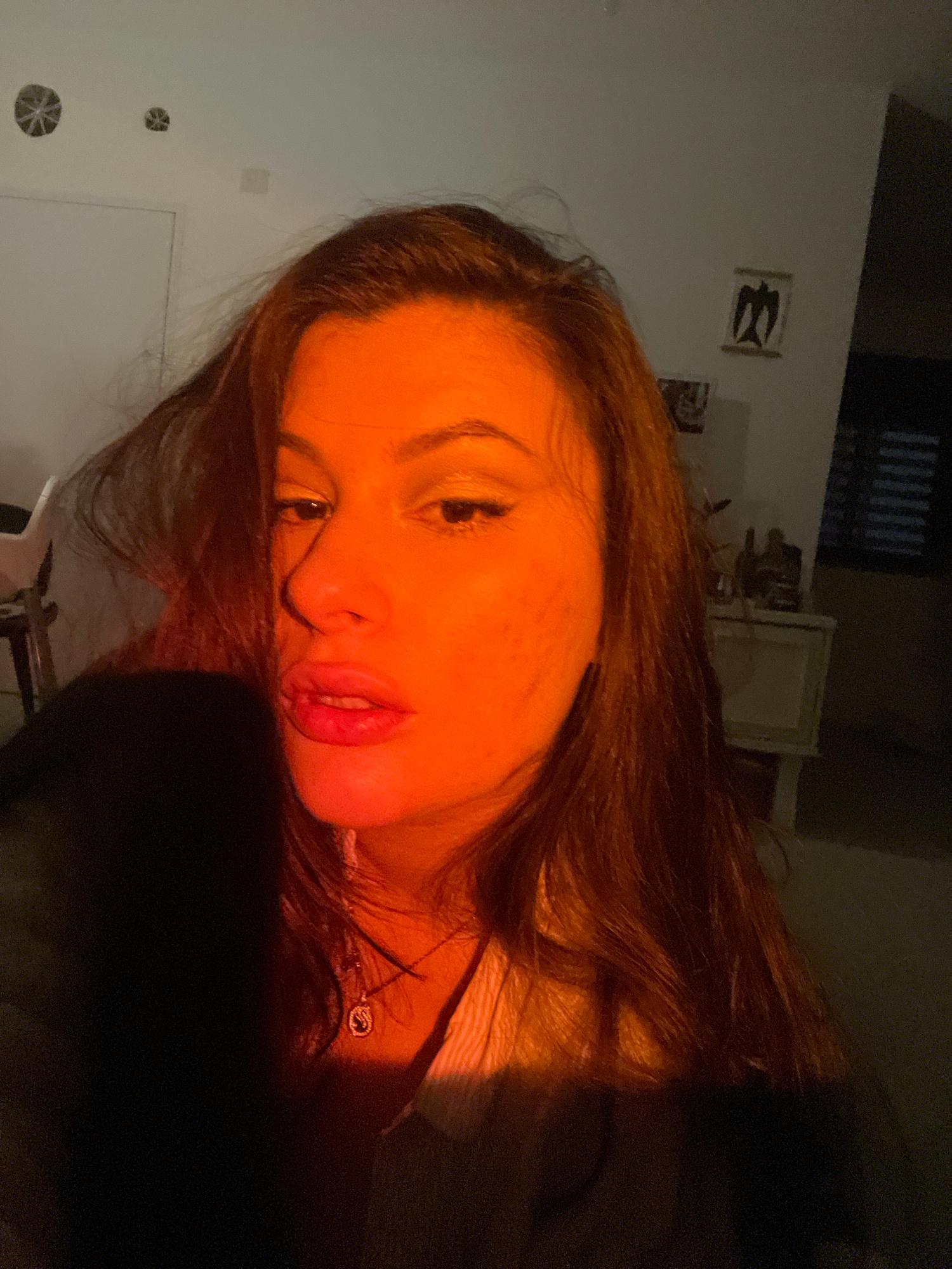 The image depicts a close-up indoor portrait of an adult female, positioned centrally and slightly angled. Her long, dark hair frames her face. The subject's face is illuminated predominantly by a str…read more