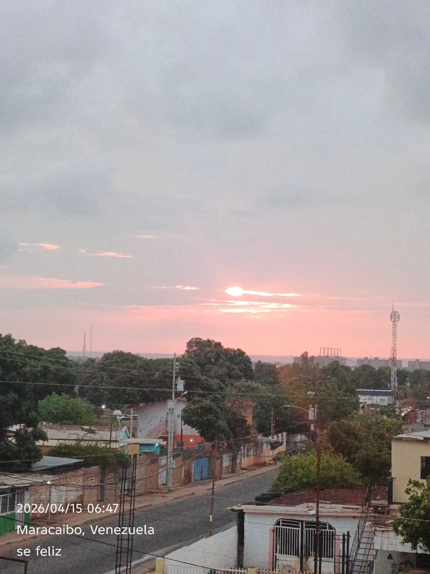 The image shows a cityscape under a pink-tinged sky at sunrise or sunset, with the sun partially obscured by clouds on the horizon. The scene includes residential buildings and trees, with utility pol…read more