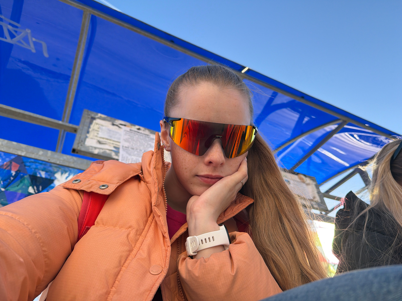 The image shows a woman wearing orange mirrored sunglasses, a beige jacket, and a white smartwatch. She is standing under a blue metal structure. The scene is in Berezniki, Russia.